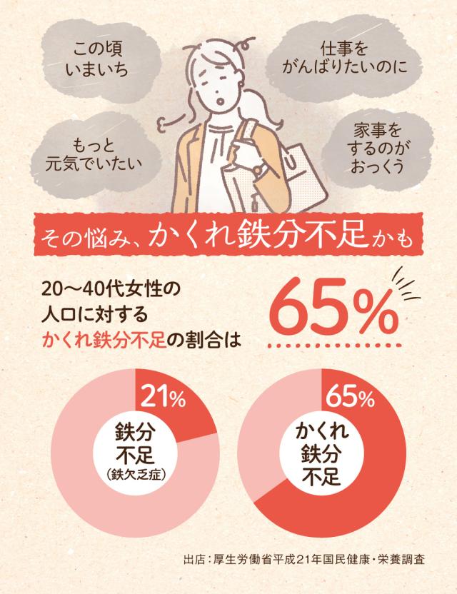 その症状、かくれ鉄分不足かも・・・ 20〜40代女性の人口に対するかくれ鉄分不足の割合は、なんと65%。
