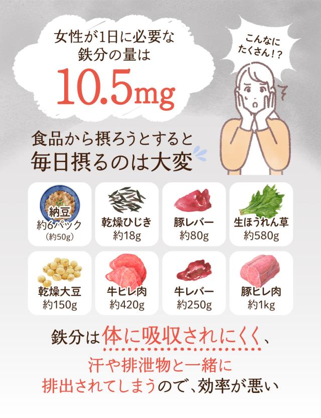 女性が1日に必要な鉄分の量は10.5mg(食事摂取基準(2020年)の鉄の1日の推奨量(月経あり))ですが、毎日食事から摂ろうと思うと大変です。 もともと鉄分は体に吸収されにくく、汗や排泄物と一緒に排出されしまいます。
