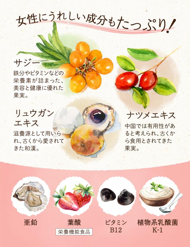 大豆抽出物(フェリチン鉄含有)(アメリカ製造)、酵母(亜鉛含有)、還元麦芽糖水飴、マルトデキストリン、沙棘濃縮果汁末、ナツメエキス末、リュウガンニクエキス末、植物性乳酸菌(殺菌)/ビタミンC、ヘム鉄、ピロリン酸第二鉄、セルロース、ラクトフェリン(乳由来)、HPC、ステアリン酸カルシウム、二酸化ケイ素、葉酸、クエン酸三ナトリウム、クエン酸、ビタミンB12