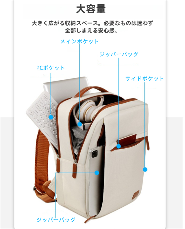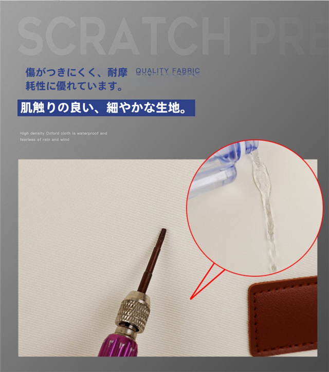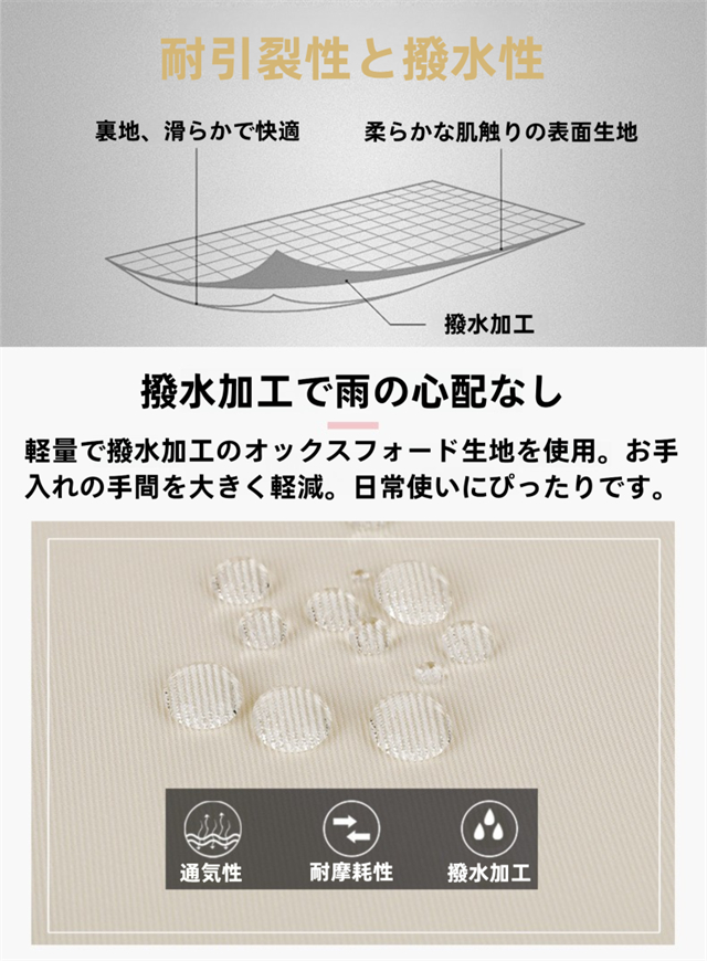 ※完全防水ではないためにご注意ください。豪雨など大量の水で濡れてしまうと、ファスナ一部や縫製部分から内側に水がしみ込む恐れがあります。