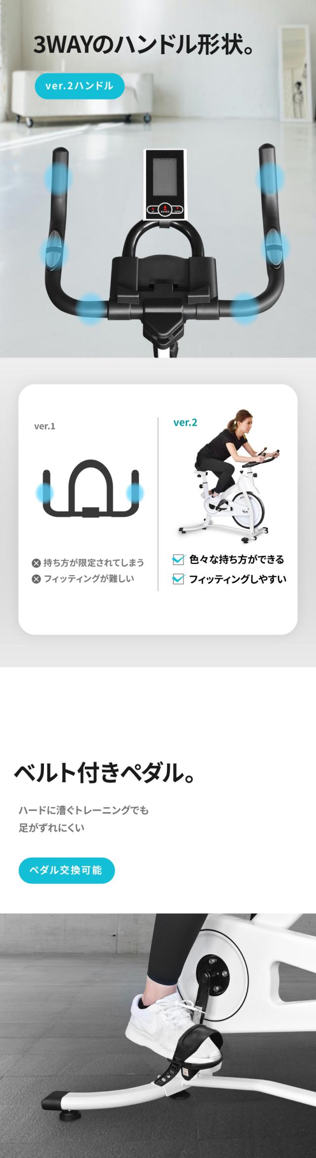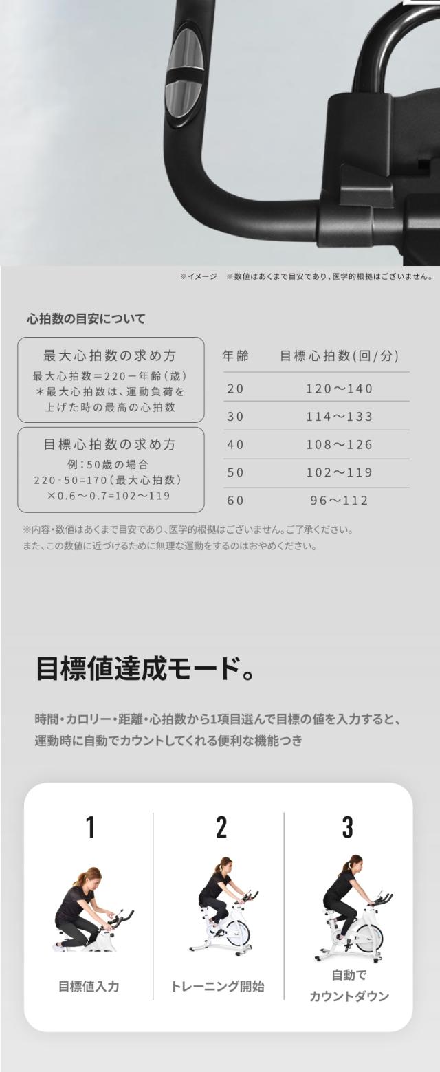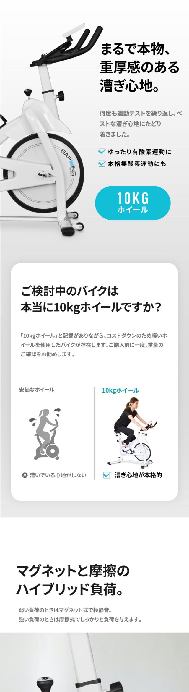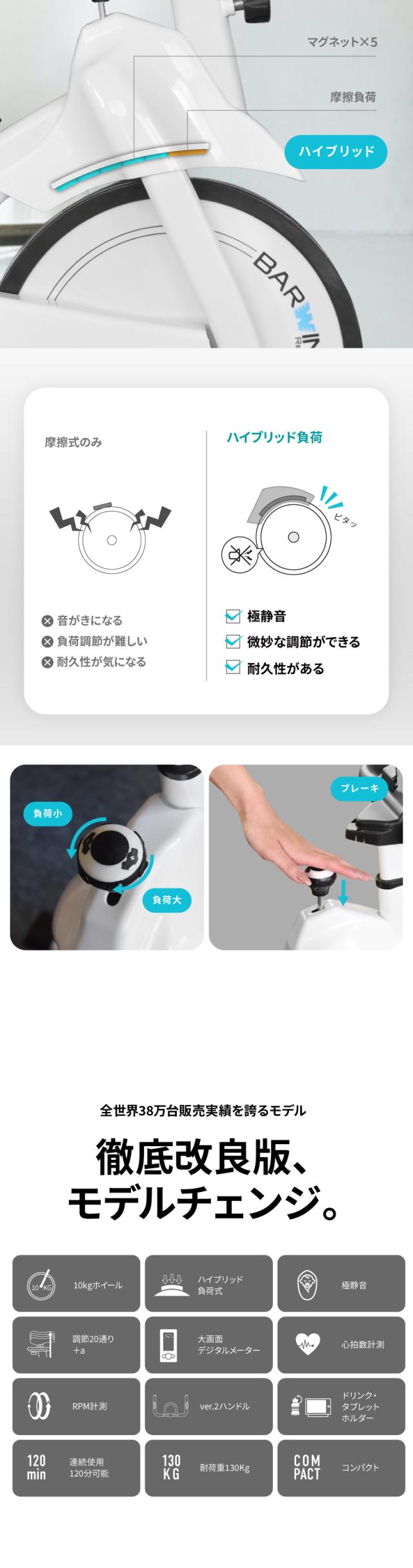 | 基本スペック | ・無段階ハイブリッド負荷式 ・20通り+aの調節 ・10kgホイール ・最新パネル ・ケイデンス計測 ・心拍センサー ・静音 ・3WAYハンドル ・フルカバーペダル ・タブレットホルダー ・ドリンクホルダー |