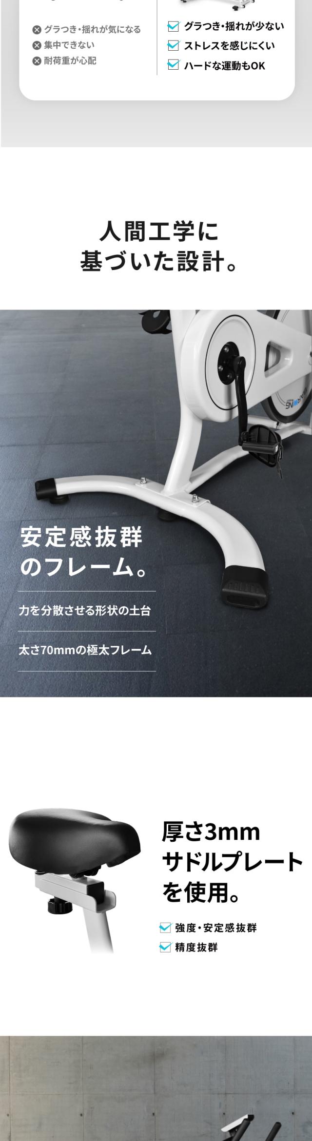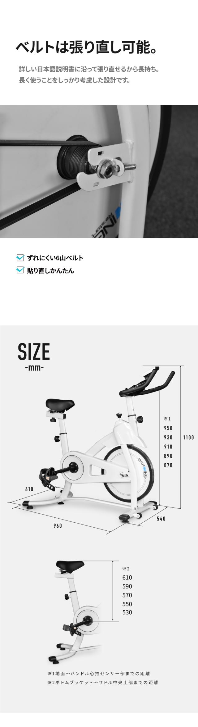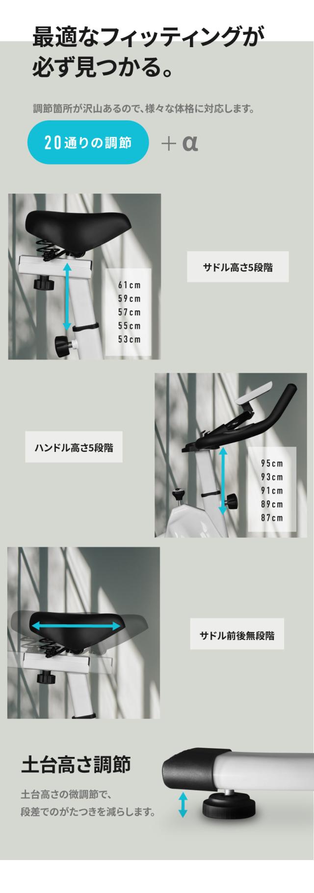 | 基本スペック | ・無段階ハイブリッド負荷式 ・20通り+aの調節 ・10kgホイール ・最新パネル ・ケイデンス計測 ・心拍センサー ・静音 ・3WAYハンドル ・フルカバーペダル ・タブレットホルダー ・ドリンクホルダー |