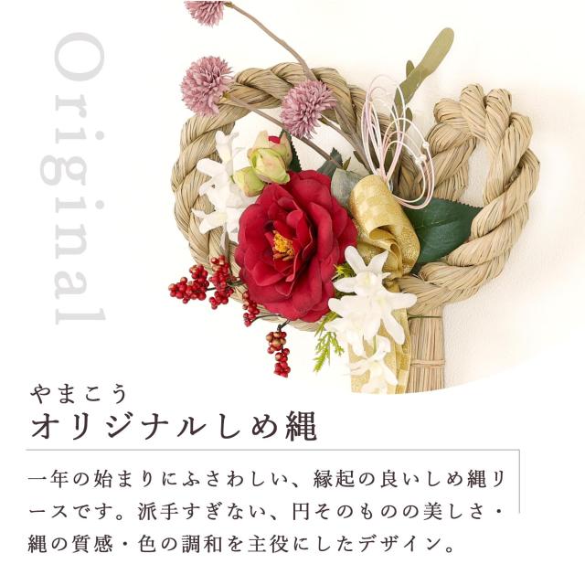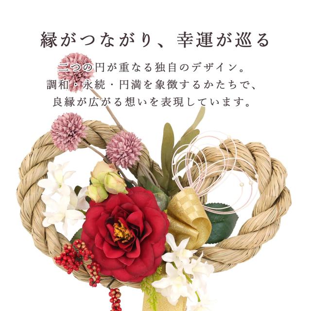 二つの円が重なり合うデザインに、「縁がつながる」「幸運が巡る」という願いを込めた、やまこうオリジナルのしめ縄リースです。