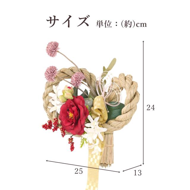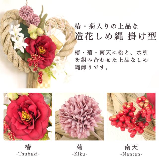 椿・菊・南天・松など、縁起の良い花々をリボンと組み合わせ、上品に仕立てました。 しめ縄の質感、色の調和を大切にしたデザインは、和の空間はもちろん、洋のインテリアにも自然に馴染みます。