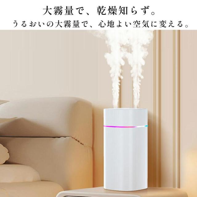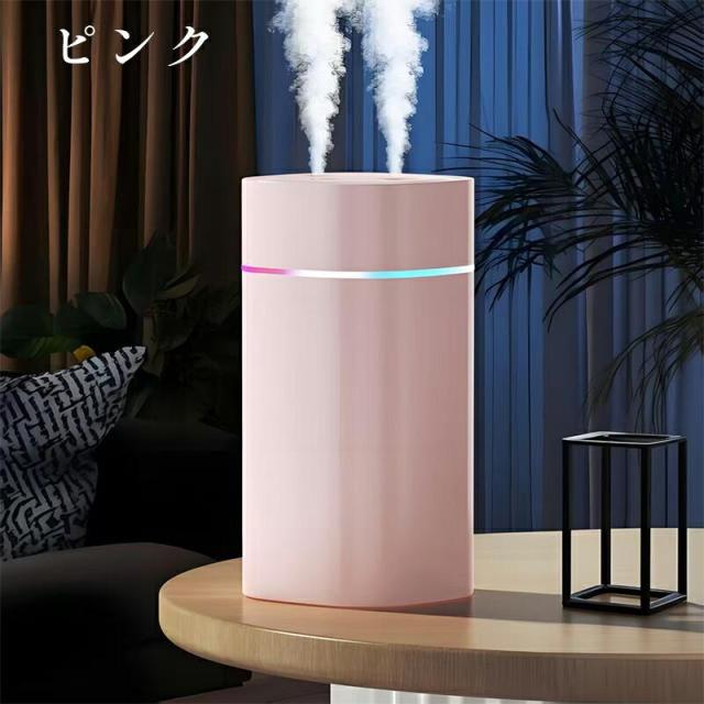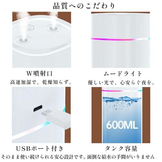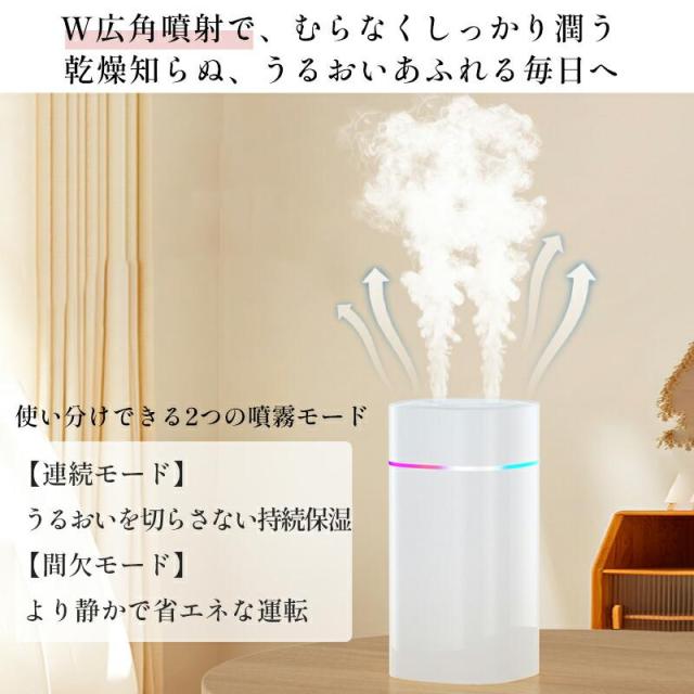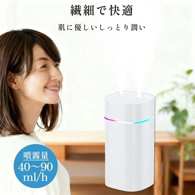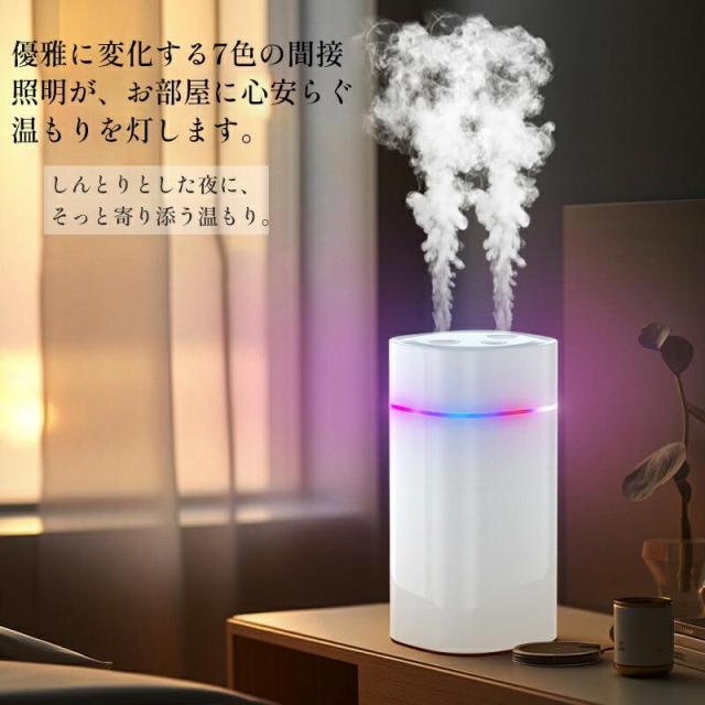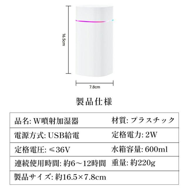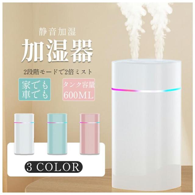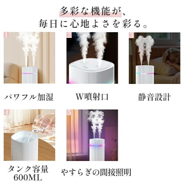 「即納」7色LED 超音波加湿器 卓上 ダブルノズルポータブル 卓上加湿器 小型加湿器 次亜塩素酸水対応 600ml大容量 2種類加湿モード 静音 保湿 USB給電式 暖房乾燥/花粉症対策 寝室 子供部屋 お手入れ簡単 オフィス 秋冬乾燥対策