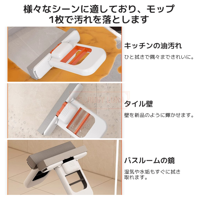 | 【手洗い不要】 | ◆スポンジモップヘッドは吸水性に優れ、やわらかく、固くならず、乾きも早いので、特にキッチンやお風呂場などの湿気の多い場所での使用に最適です。掃除が終わったら、手洗いせずに直接きれいな水でヘッドを洗うだけです。 |