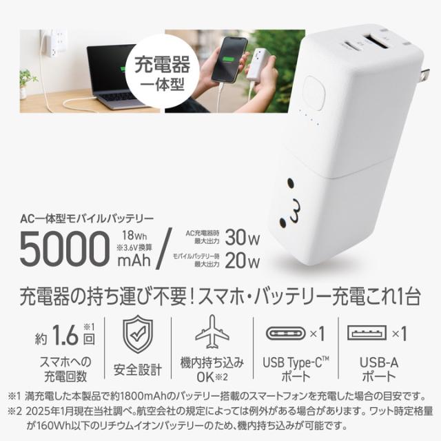 エレコム モバイルバッテリー AC充電器 一体 5000mAh 30W C×1+A×1 リチウムイオン電池 USB Power Delivery対応 USB-C入出力 USB-A出力 PSE適合 しろちゃん ┃DE-AC14-5000WF