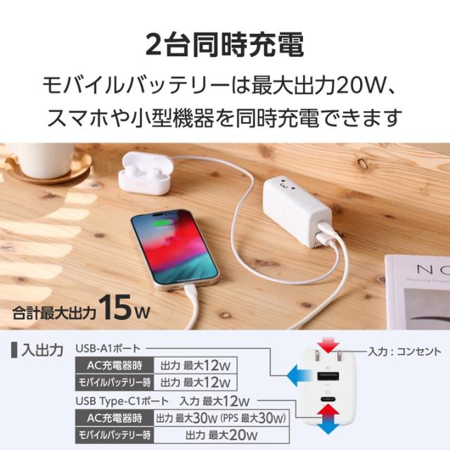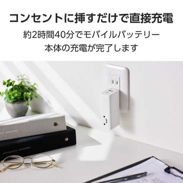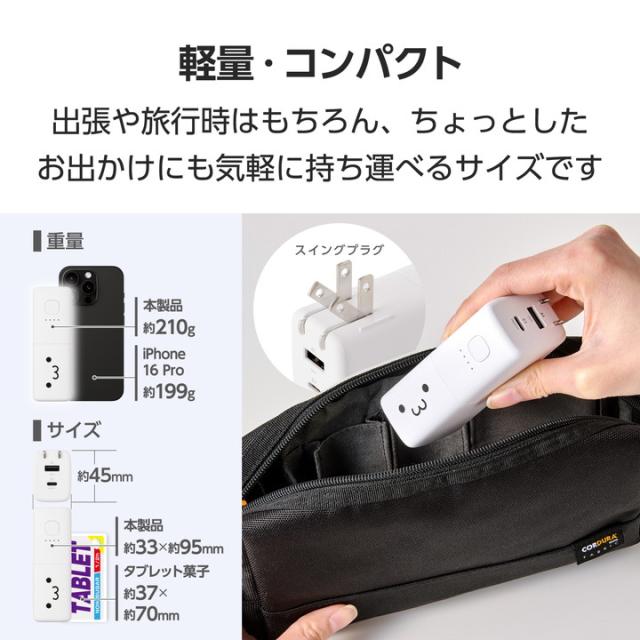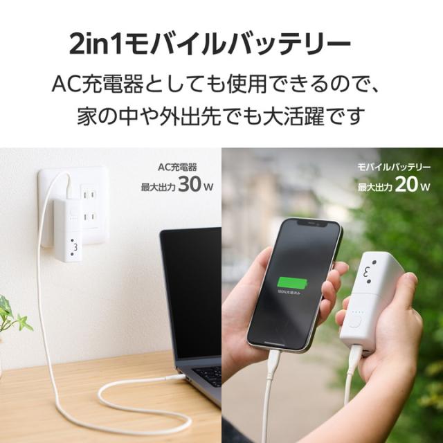 AC充電器としてもモバイルバッテリーとしても使用可能な2in1タイプ!ポーチやポケットにすっぽり収まる手のひらサイズ。2ポート搭載で複数のデバイスを一気に充電できる、AC充電器一体型モバイルバッテリーです。かわいいしろちゃんモデルです。![]() ■1台2役で使える、USB Power Delivery AC充電器一体型モバイルバッテリーです。 ■USB Type-C(TM)ポート×1、USB-Aポート×1を搭載。スマートフォンとワイヤレスイヤホンなど、複数のデバイスを接続して一気に充電できます。 ■ポーチや小さなバッグ、ポケットにもすっぽり収まる手のひらサイズ。出張や旅行時はもちろん、ちょっとしたお出かけの際も気軽に持ち運べます。 ■モバイルバッテリー使用時最大出力20Wだから、スマートフォンを高速充電可能。外出先での急な充電切れの際も安心です。 ■本製品をコンセントに挿した状態でスマートフォンを接続することで、AC充電器としても使えます。 ■AC充電器として30Wの出力が可能。スマートフォンやタブレットはもちろん、MacBook Airなどのノートパソコンの充電にも使えます。 ■※30Wまでで充電可能なノートパソコンに限ります。 ■USB Power Delivery(PD)規格およびPPS規格に対応。接続機器に応じて電圧や電流を自動調整するため、iPhoneなどのスマートフォンやiPadなどのタブレットはもちろん、ノートパソコンまで幅広く充電できます。 ■※USB Power Deliveryとは、アダプターと接続機器間で情報をやり取りすることで、その機器間における最適な電力を選択し、高速充電を実現するUSB規格です。PPS(Programmable Power Supply)とは、0.02V単位で電圧を調整し、最適な電力で効率的に供給することができるUSB Power Deliveryのオプション規格です。 ■本製品とスマートフォンを同時に接続することでまとめて充電できる“まとめて充電”に対応しています。 ■※本製品はパススルー充電に対応しており、バッテリーを介さずに充電器から接続機器へ直接充電するため、電池の劣化を抑えられます。 ■コンセントに挿すだけで本製品を直接充電可能。本製品は約2時間40分で充電できます。 ■※本製品のみを充電した場合の目安時間です。 ■低電流モードにより、Bluetooth(R)ヘッドセット・イヤホンなどの小型電子機器を最適な電流で充電できます。 ※USB-Aポートのみ対応 ■接続機器を見分けて最適な充電を行う”おまかせ充電”に対応しています。 ※USB-Aポートのみ対応 ■電源プラグ部分にはスイングプラグ機構を採用。回転させて本体に収納できるためスマートに持ち運べます。 ■本製品(バッテリー容量5000mAh)で、1800mAhのスマートフォンを約1.4回、3000mAhのスマートフォンを約0.8回充電可能です。 ■※満充電した本製品で電源オフの状態のスマートフォンを充電する際の目安回数です。充電中に電源を入れたり、機器を使用したりしている場合は記載の数値まで充電できない場合があります。 ■Nintendo Switch(TM) 2/Nintendo Switch(TM)/Nintendo Switch Lite(TM)の充電が可能です。 ■※Nintendo Switchシリーズは動作モードによっては充電しながらのゲームプレイができない場合があります。また、Nintendo Switch2ではドック併用での使用には対応していません。 ■電池残量は4段階のLEDランプ点灯で確認できます。 ■約500回繰り返し使用可能な充電式リチウムイオン電池を搭載しています。 ■内蔵の充電式リチウムイオン電池は、JIS C 62133-2:2020およびJIS C 8715-2:2024に準拠した安全設計です。 ■日本の電気用品安全法(PSE)の技術基準に適合した安全性の高い商品です。 ■過充電・過放電・過電流防止機能および短絡保護機能と温度検知機能の5つの保護機能を備えた安心の回路設計です。 ■Thermal Protectionを搭載し、通電時に温度を監視・制御することで、お使いの機器を守ります。 ■電池容量が160Wh(43,243mAh)以下であるため、機内持ち込みも可能です。 ■※航空会社の規定によって例外がある場合があります。 ■※工場出荷時に70%程度充電されています。充電式リチウムイオン電池は時間とともに放電するので、ご使用になる前に充電することを推奨します。 ■※ケーブルを挿したままにするとバッテリーの残量が減ってしまいます。使用しない場合は必ずケーブルを外してください。 ■※本製品とスマートフォンを接続するケーブルは付属していません。 ■※USB Type-C and USB-C are trademarks of USB Implementers Forum. ■本製品は、一般社団法人JBRCの回収対象製品であり、回収協力自治体や協力店(家電量販店・ホームセンターなど)で回収が可能です。 ■※JBRCのホームページでお住まいの地域の回収協力自治体・協力店をご確認ください。 ■筐体には再生プラスチックを採用しています。 ■管理された森林から生産された紙を使用し、環境負荷の低い、プラスチックレスパッケージを実現しています。 ■自社環境認定基準を1つ以上満たし、『THINK ECOLOGY』マークを表示した製品です。 ■環境保全に取り組み、製品本体の主たる構成部品や構成要素の原料に占めるリサイクル原料の割合が10%を超