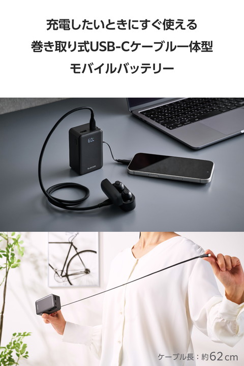 スッと伸ばして、くるっと収納!持ち運びに便利な本体一体型の巻き取り式USB Type-C(TM)ケーブルを備えたモバイルバッテリーです。最大出力35Wなので、スマートフォンやタブレットはもちろん、ノートパソコンの充電も可能。容量10000mAhで外出先でも安心して充電できます。ケーブルを持ち忘れる心配がなく、必要な長さに調節して使用できます。