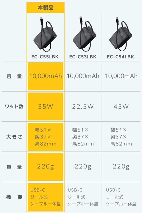 エレコム モバイルバッテリー 巻き取り式 ケーブル一体型 10000mAh 35W リチウムイオン電池 残量表示 USB-Cケーブル USB-C USB-A ブラック ┃EC-C55LBK