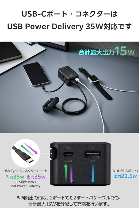 スッと伸ばして、くるっと収納!持ち運びに便利な本体一体型の巻き取り式USB Type-C(TM)ケーブルを備えたモバイルバッテリーです。最大出力35Wなので、スマートフォンやタブレットはもちろん、ノートパソコンの充電も可能。容量10000mAhで外出先でも安心して充電できます。ケーブルを持ち忘れる心配がなく、必要な長さに調節して使用できます。![]() ■本体一体型の巻き取り式USB Type-C(TM)ケーブルを備えた、容量10000mAhのモバイルバッテリーです。 ■本体一体型ケーブルは巻き取り式のため、使用後はケーブルを巻き取って、すっきりと収納可能。ケーブルの長さは約62cmあり、必要な分だけ引き出して充電しながらスマートフォンを使用できます。 ■一体型のUSB Type-Cケーブルに加え、USB Type-Cポート×1とUSB-Aポート×1も搭載しています。 ■※複数の機器を同時に充電する場合は、1ポート/1ケーブルあたりの出力が低下するため、ご使用の機器によっては充電できない場合があります。 ■※同時出力時は、2ポートでも2ポート/1ケーブルでも、合計最大15Wを分配して充電を行います。 ■最大35Wの高出力でスマートフォンやタブレットを充電できるのはもちろん、MacBook Airなどのノートパソコンにも対応しているため、外出先で急にバッテリーが切れても安心です。 ■※一体型のUSB Type-Cケーブル、またはUSB Type-Cポートの単独出力時に限ります。 ■※35W以下のUSB Type-C入力に対応したパソコンに限ります。 ■USB-Aポートの単独使用時は最大22.5Wの出力が可能です。 ■モバイルバッテリーはUSB Type-C充電式です。AC充電器に接続して充電してください。 ■※AC充電器は同梱しておりません。別途ご購入またはご用意ください。 ■※AC充電器は35W以上を推奨します。35W未満のAC充電器で充電した場合や、USB Type-C - USB-Aケーブルで充電した場合、パッケージやHPに記載の時間では満充電にならない場合があります。 ■本体充電用ケーブルを接続したままで、モバイルバッテリーとスマートフォンをまとめて充電できる”まとめて充電”に対応しています。 ■※本製品はパススルー充電に対応しており、バッテリーを介さずに充電器から接続機器へ直接充電するため、電池の劣化を抑えられます。 ■低電流モードによりBluetooth(R)ヘッドセット・イヤホンなどの小型電子機器を最適な電流で充電できます。 ■※USB-Aポートのみ対応します。 ■接続機器を見分けて最適な充電を行う”おまかせ充電”に対応しています。 ■※USB-Aポートのみ対応します。 ■USB Power Delivery(PD)規格およびPPS規格に対応。接続機器に応じて電圧や電流を自動調整するため、iPhoneなどのスマートフォンやタブレット等を効率的に充電できます。 ■※USB Power Deliveryとは、アダプターと接続機器間で情報をやり取りすることで、その機器間における最適な電力を選択し、高速充電を実現するUSB規格です。PPS(Programmable Power Supply)とは、0.02V単位で電圧を調整し、最適な電力で効率的に供給することができるUSB Power Deliveryのオプション規格です。 ■本製品(バッテリー容量10000mAh)で、1800mAhのスマートフォンを約3.3回、3000mAhのスマートフォンを約1.9回充電可能です。 ■※満充電した本製品で電源オフの状態のスマートフォンを充電する際の目安回数です。充電中に電源を入れたり、機器を使用したりしている場合は記載の数値まで充電できない場合があります。 ■LEDパネルでバッテリー残量を1%単位で確認しながら使えます。事前にモバイルバッテリーを充電する際などに便利です。 ■NINTENDO SWITCH(TM) 2/NINTENDO SWITCH(TM)/NINTENDO SWITCH Lite(TM)対応です。 ■※ドックでの使用に対応していません。 ■約1000回繰り返し使用可能な充電式リチウムイオン電池を搭載しています。 ■Thermal Protectionを搭載し、製品温度の上昇を監視・制御。自動で出力をコントロールし、お使いの機器を守ります。 ■過充電・過放電・過電流防止機能および短絡保護機能と温度検知機能の5つの保護機能を備えた安心の回路設計です。 ■電池容量が160Wh(43,243mAh)以下であるため、機内持ち込みも可能です。 ■※航空会社の規定によって例外がある場合があります。 ■日本の電気用品安全法(PSE)の技術基準に適合した安全性の高い商品です。 ■内蔵の充電式リチウムイオン電池は、JIS C 62133-2:2020およびJIS C 8715-2:2024に準拠した安全設計です。 ■※工場出荷時に70%程度充電されています。充電式リチウムイオン電池は時間とともに放電するので、ご使用になる前に充電することを推奨します。 ■※ケーブルを挿したままにしておくとバッテリーの残量が減ってしまいます。使用しないときは、必ずケーブルを外してください。 ■※一体型USB Type-CケーブルおよびUSB Type-Cポートのいずれからも本製品を充電できますが、同時に入力することはできません。 ■※USB Type-C and USB-C are trademarks of USB Implementers Forum. ■本製品は、一般社団法人JBRCの回収対象製品であり、回収協力自治体や協力店(家電量販店・ホームセンターなど)で回収が可能です