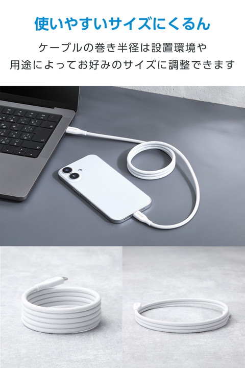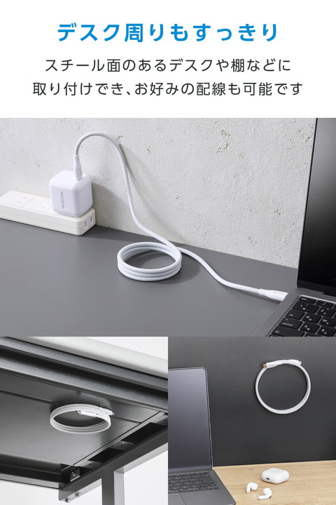 メッシュ×磁石の力で、くるんとまとまり小さく収納!持ち運びに便利なUSB Type-C(TM)(USB2.0)ケーブルです。鉄製の机や棚に吸着し、配線を自在にアレンジできます。耐久性に優れたナイロンメッシュを採用。USB Power Delivery最大60Wの充電に対応し、スマートフォンやタブレットなどを充電できます。