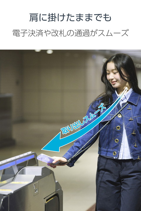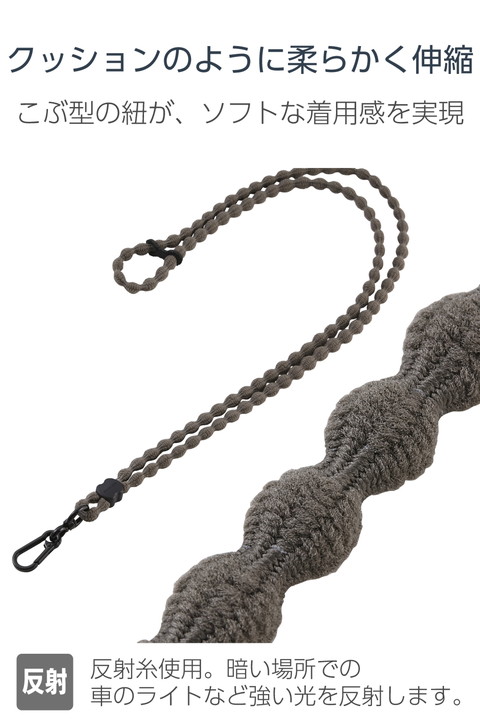 特許取得のこぶ型ひもを使った、柔らかく伸びるAIRFLEXシリーズのショルダーストラップです。肩に掛けたままでも電子決済や改札の通過がスムーズにでき、両手が空くので外出やお出かけも快適。反射糸が光を反射するため、夜間の外出時も安心して使えます。
