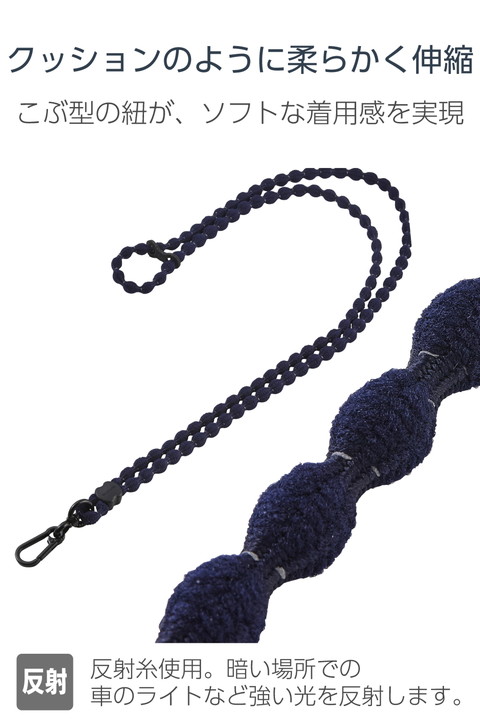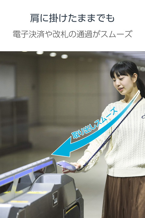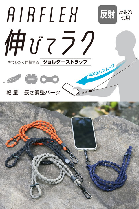 特許取得のこぶ型ひもを使った、柔らかく伸びるAIRFLEXシリーズのショルダーストラップです。肩に掛けたままでも電子決済や改札の通過がスムーズにでき、両手が空くので外出やお出かけも快適。反射糸が光を反射するため、夜間の外出時も安心して使えます。