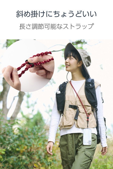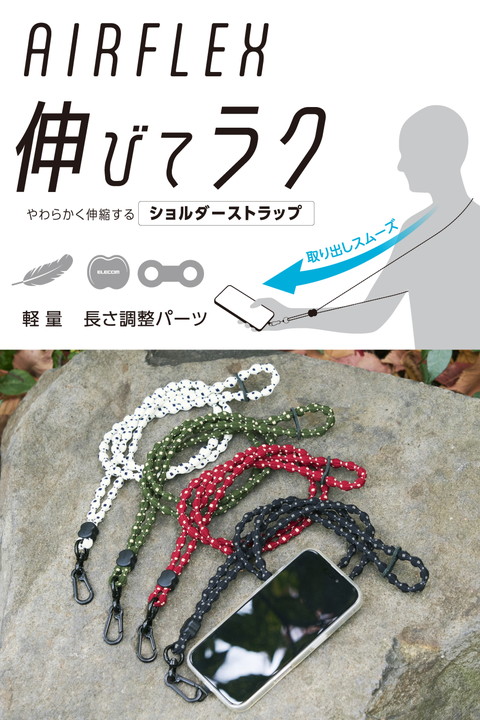 特許取得のこぶ型ひもを使った、柔らかく伸びるAIRFLEXシリーズのショルダーストラップです。肩に掛けたままでも電子決済や改札の通過がスムーズにでき、両手が空くので外出やお出かけも快適。どんなコーデにも合わせやすいカジュアルデザインです。![]() ■特許取得のこぶ型ひもを採用。モコモコの形と伸縮素材が肩への負担をやさしく分散し、しなやかにフィットします。 ■ひもは柔らかく伸縮し、肩に掛けたままでも電子決済や改札の通過がスムーズにできます。 ■独自構造で肌への密着を抑え、いつでもさらっと快適。長時間でも心地よく使えます。 ■軽量設計で、散歩やランニング、アウトドアや旅行など、アクティブなシーンでも軽やかに装着できます。 ■どんなコーデにも合わせやすいカジュアルデザイン。アウトドアや普段使いにぴったりです。 ■斜め掛けにできるので、両手が空き、普段のお出かけはもちろん、お仕事や旅行などのイベント時にも便利。落下や盗難、紛失防止にも役立ちます。 ■取り外しやすいカラビナ付きで、使わないときはスマートフォンを簡単に取り外せます。 ■ストラップは調節パーツでお好みの長さにできます。 ■ケースにフィットする0.2mmの薄型ストラップホールシートを付属。ケースにストラップホールがなくても、スマートフォンとケースの間に挟むだけで使用できます。 ■ストラップホールシートはステンレス製で、通常製品の約4倍の耐久性があります。 ■ストラップホールシートを挟んだまま充電が可能です。 ■※ケースの種類は、ハイブリッドケース、ソフトケースをご使用ください(ケース背面が硬い素材のものを推奨します)。シリコン製のケースには使用しないでください。 ■※ケーブル穴が大きく開口しているケースでの使用は推奨していません。 ■※耐荷重は約10kgまでです。また、250g以上の機器本体には使用しないでください。 ■自社環境認定基準を1つ以上満たし、『THINK ECOLOGY』マークを表示した製品です。 ■環境への負荷軽減のため、輸送効率を高める設計の外装箱を使用した製品です。 ![]() ■サイズ:ショルダーストラップ:全長約1200mm、ストラップホールシート:幅約45mm×厚み約0.2mm×高さ約23mm ■耐荷重:約10kgまで ※250g以上の機器本体には使用しないでください。 ■セット内容:ショルダーストラップ×1、ストラップホールシート(1口)×1 ■材質:ショルダーストラップ:ナイロン・ラテックス・人工皮革・亜鉛合金・ABS、ストラップホールシート:ステンレス ■カラー:バーガンディー |