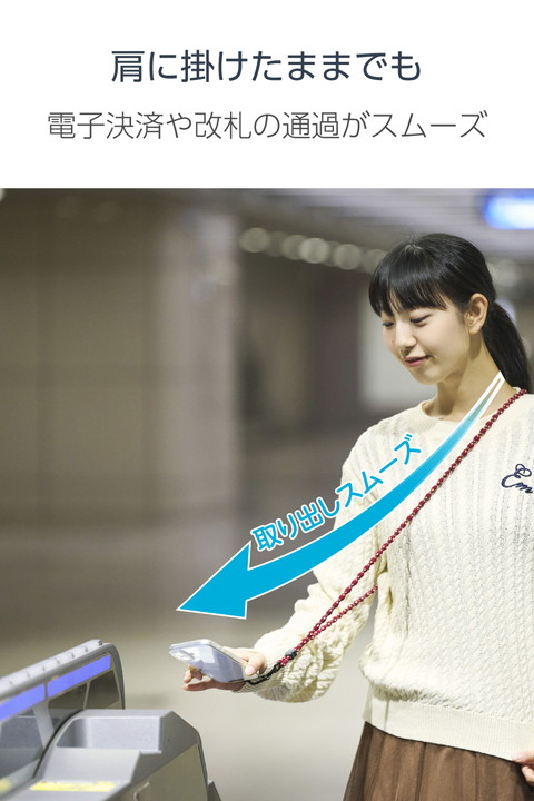 特許取得のこぶ型ひもを使った、柔らかく伸びるAIRFLEXシリーズのショルダーストラップです。肩に掛けたままでも電子決済や改札の通過がスムーズにでき、両手が空くので外出やお出かけも快適。どんなコーデにも合わせやすいカジュアルデザインです。