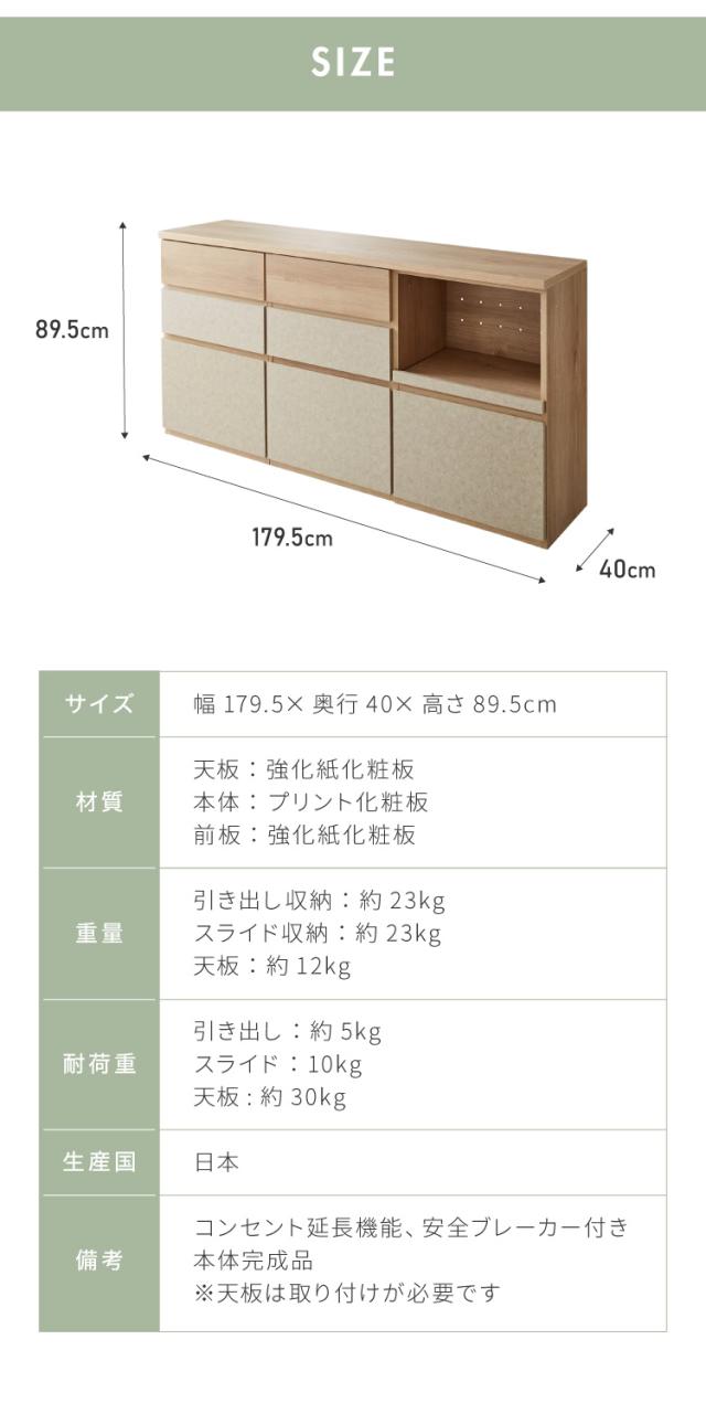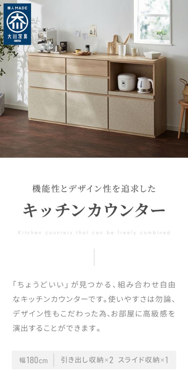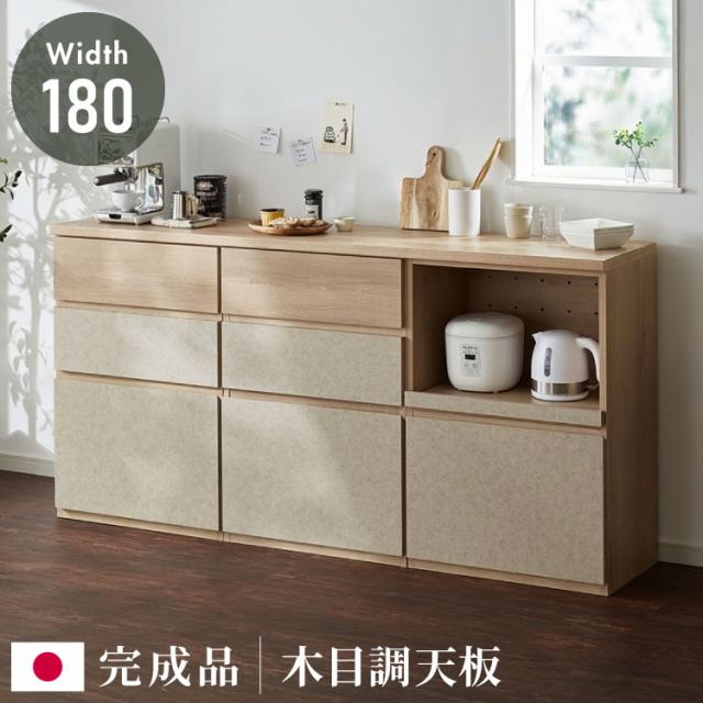 キッチンカウンター 幅180 完成品 日本製 レンジ台 ナチュラル 天板 引き出し キッチンラック キャビネット サイドボード オープン スライド モダン セラミック調 国産 大川家具(代引不可)【送料無料】