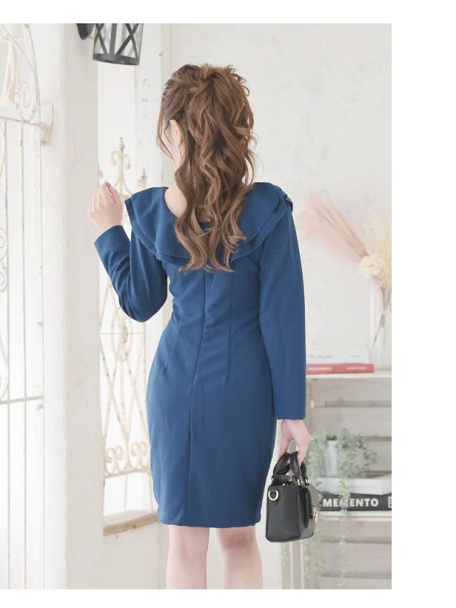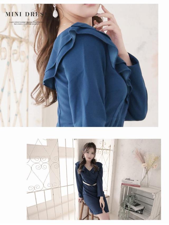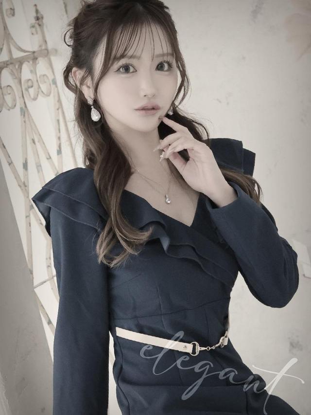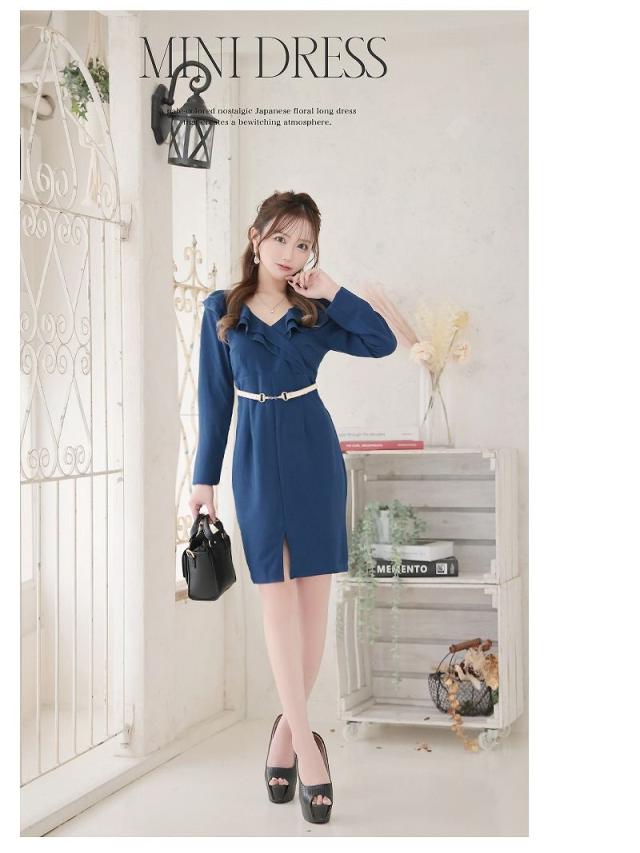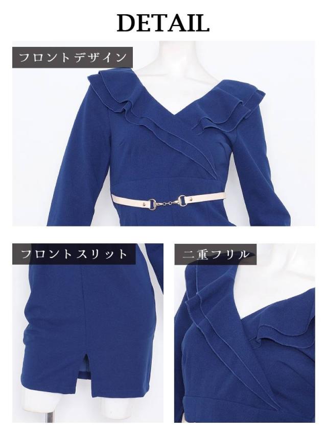 キャバワンピース RyuyuChick 長袖 袖付き ベルト付き フリルネック タイトワンピ キャバ ワンピース ワンピ キャ