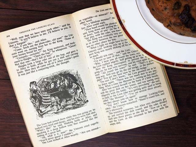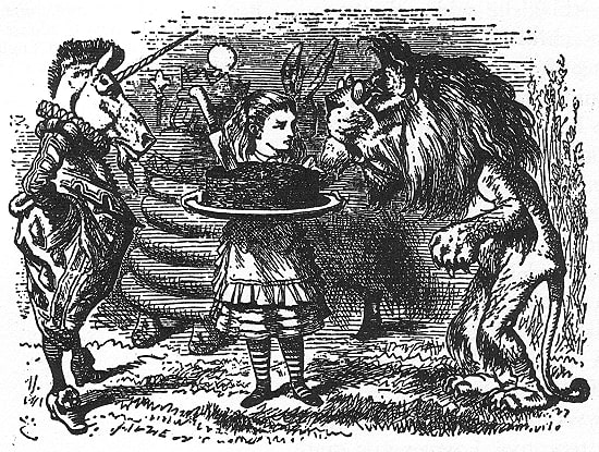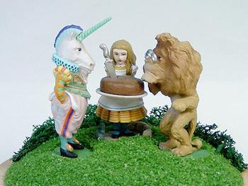 | 「不思議の国のアリス」の続編「鏡の国のアリス」にこのような挿絵が描かれていますが、アリスが手にしているのがプラムケーキです。ライオンとユニコーンが王冠をめぐって争っているシーンですが、ライオンはイギリスを表し、ユニコーンはスコットランドを表していて、これが英国王室の紋章になっています。(英国の紋章ではライオンとユニコーンの位置が逆) | |