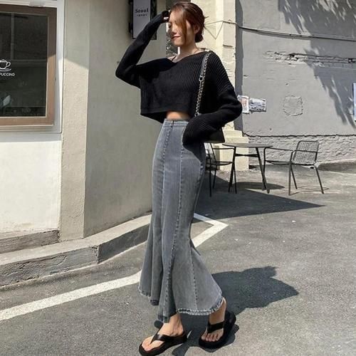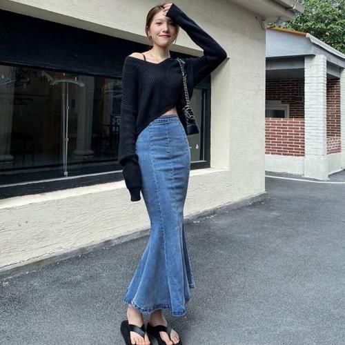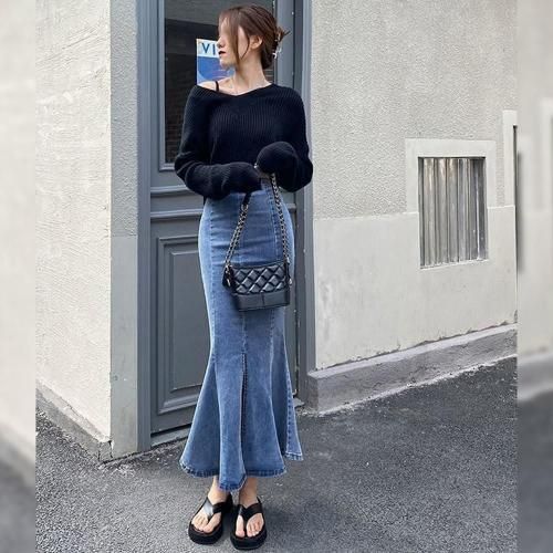 カジュアルなデニムに女性らしい曲線美をプラスし、履くだけで理想のスタイルを完成させてくれるストレッチ素材のマーメイドロングスカート。