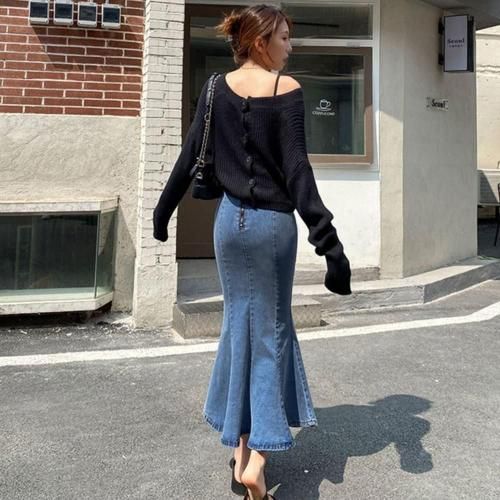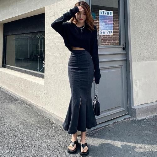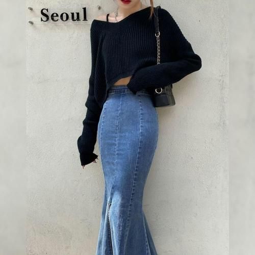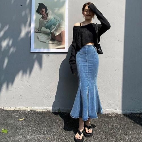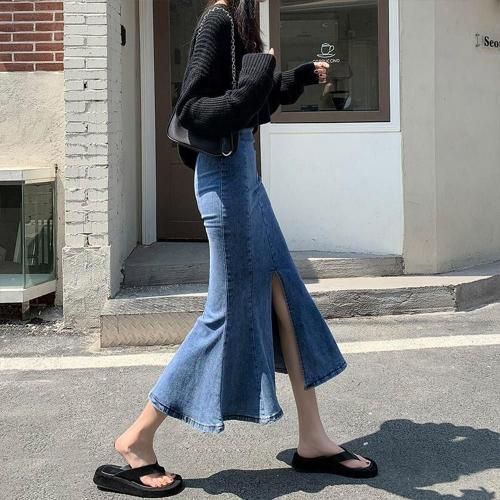 スカート セクシー レディース マーメイドライン カジュアル くびれ デニム シルエット ストレッチ スリット タイト フレア ふんわり ロング 快適 軽やか 伸縮性 ブラック ブルー S M L XL