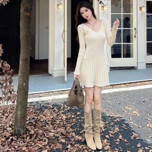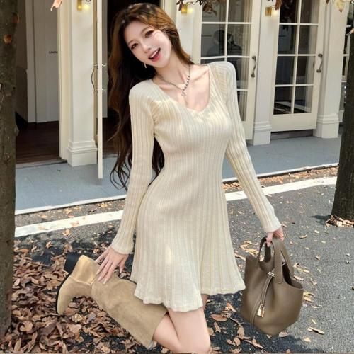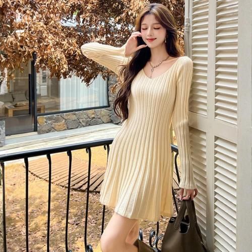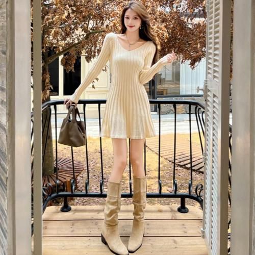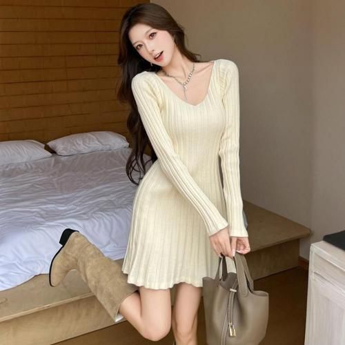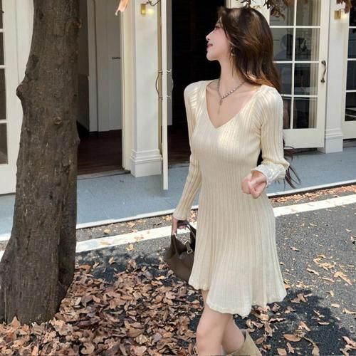 Aラインのフレア裾でスタイルアップも叶えるVネックリブニットミニワンピース(キャバドレス・CABARETDRESS)。