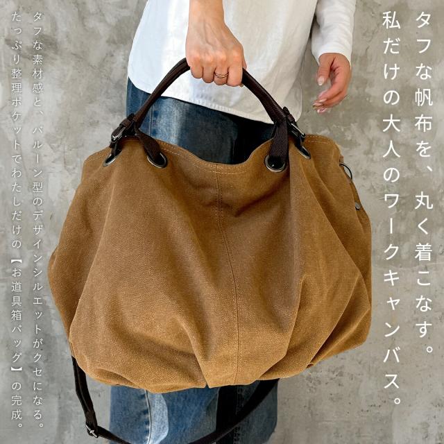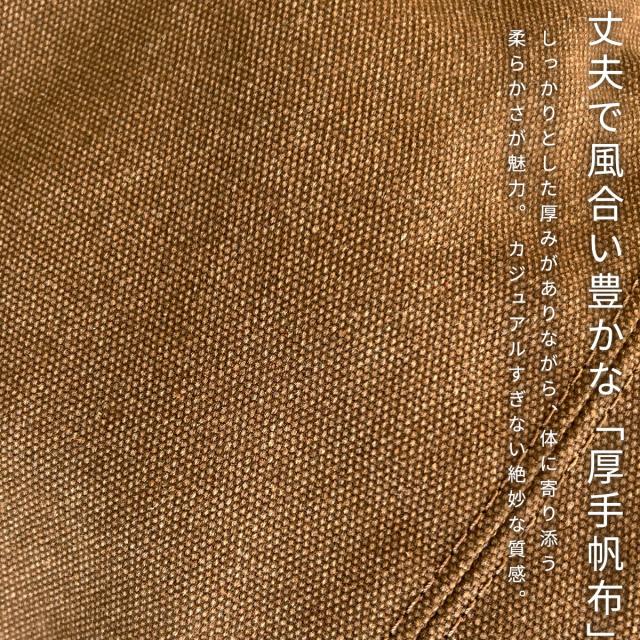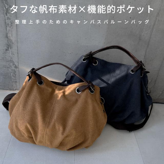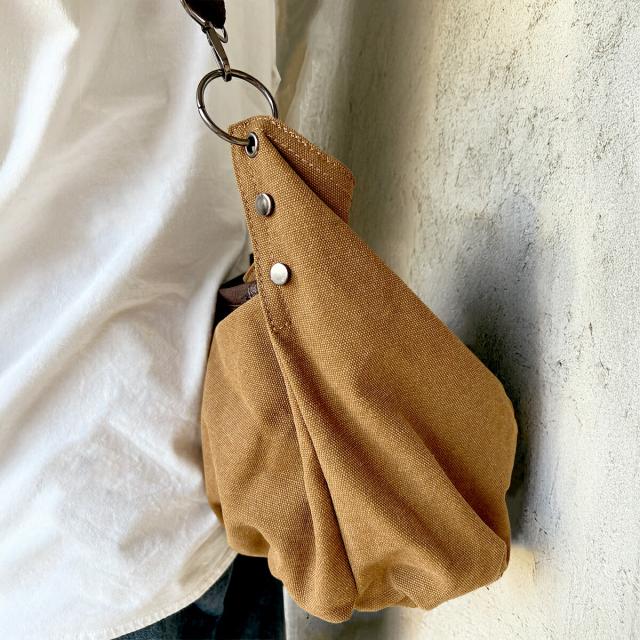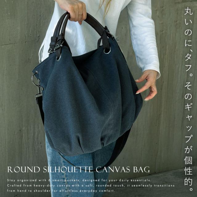 丈夫で厚手な帆布(キャンバス)を使用し、使い込むほど味が出るビンテージ風の質感が魅力。無骨な素材を丸型バルーンバッグに仕立て、女性ならマニッシュに、メンズもかっこいい絶妙なバランスを実現。