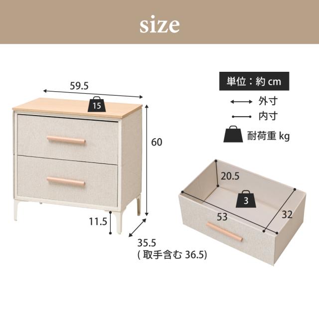 ・本体外寸:幅約59.5×奥行約35.5(取っ手を含む奥行36.5)×高さ約60cm ・本体下高さ:約11.5cm ・引き出し有効(最大)内寸:奥行約53×奥行約32×高さ約20.5(21)cm |