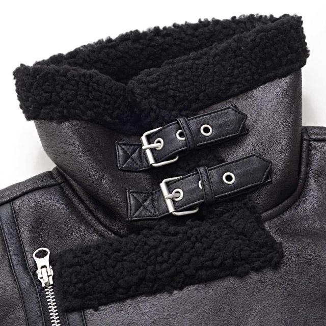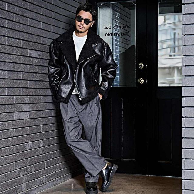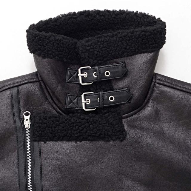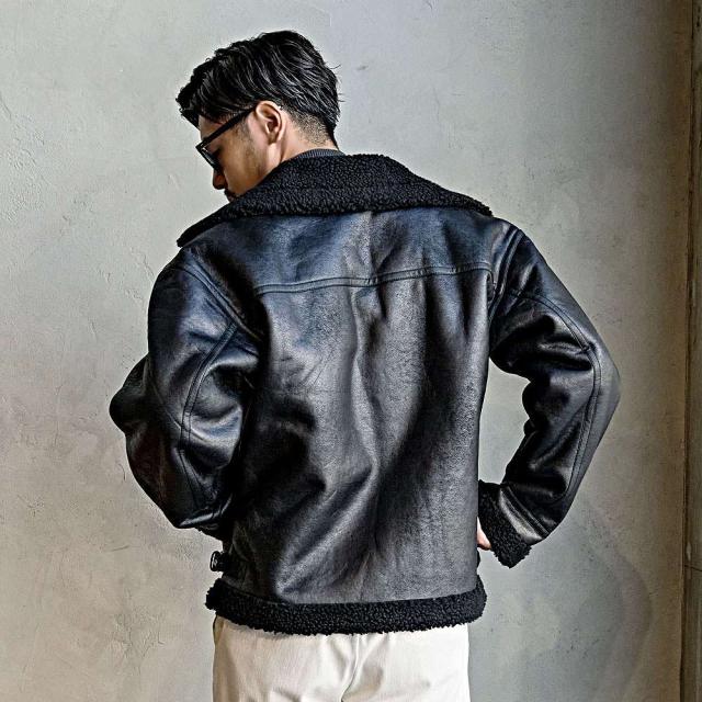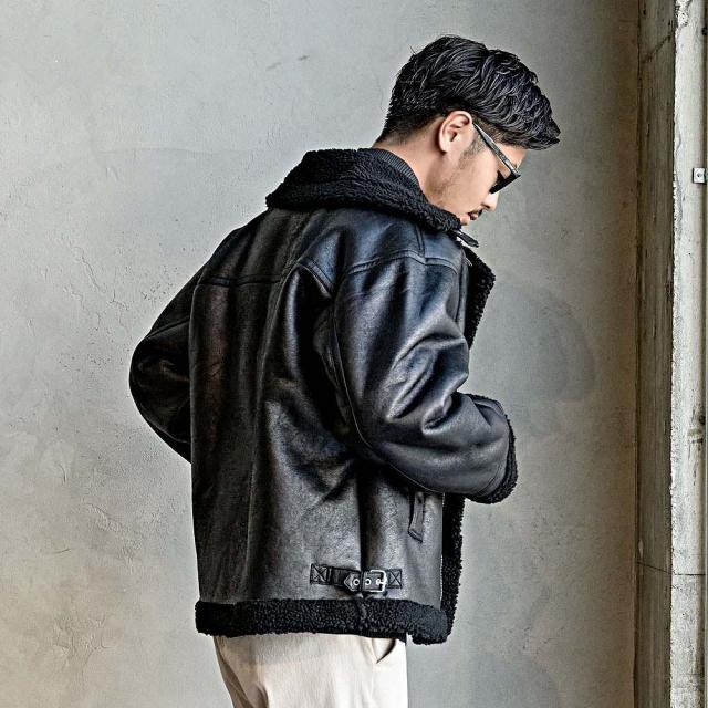 重厚感のあるダブルデザインをベースに、ムートン風の素材と味わい深いヴィンテージ加工を掛け合わせた、秋冬の主役級アウター。