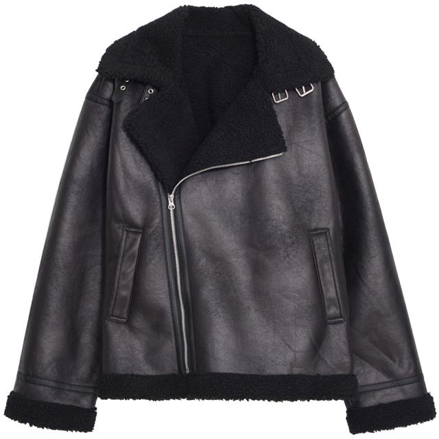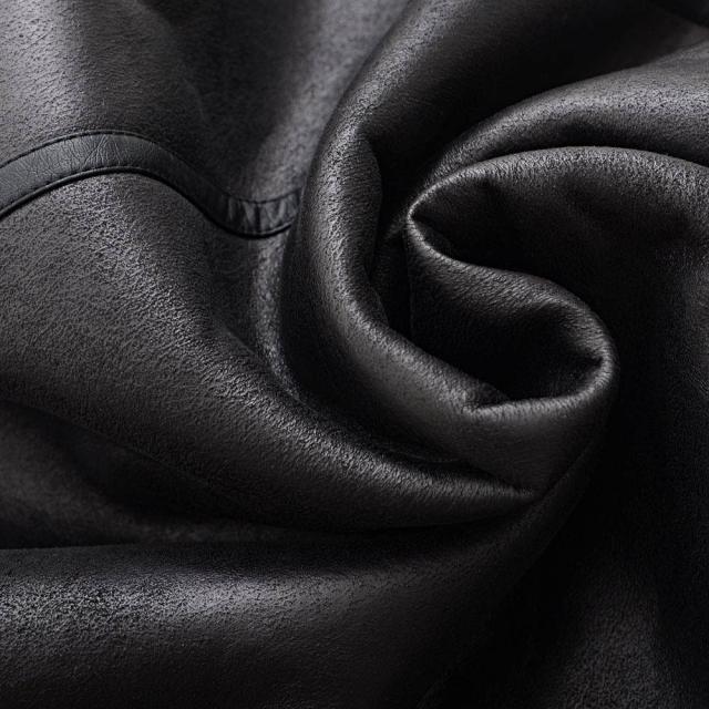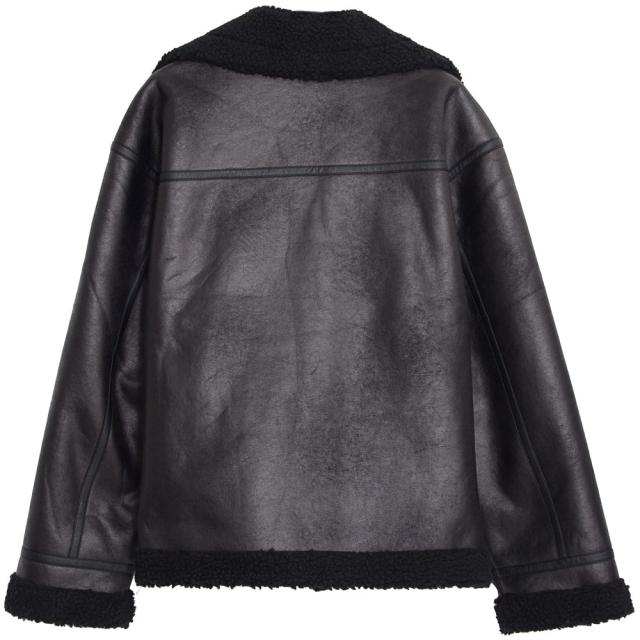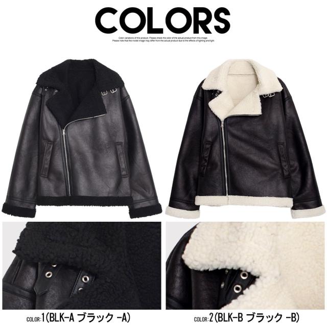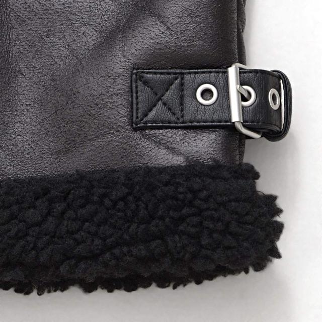 表地にはマットなツヤ感を持つフェイクレザー、裏地にはふんわり柔らかなボアを採用し、デザイン性・保温性ともに優秀な一枚に仕上げています。