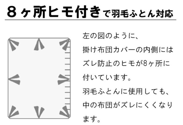 8ヶ所ヒモを使用しているので、掛け布団がカバーの中で動くことを防ぎます。