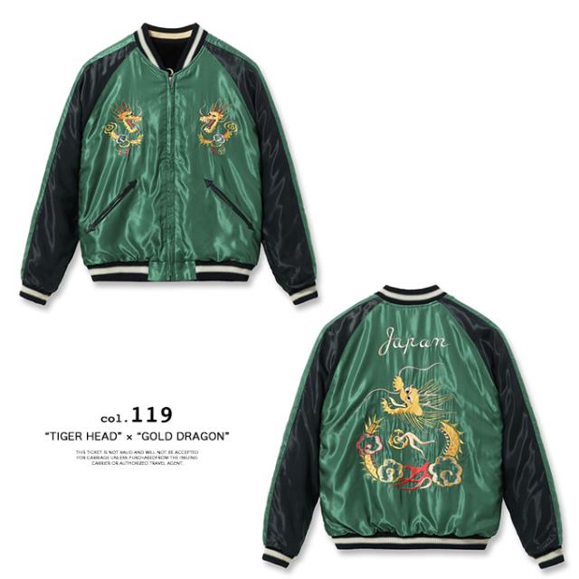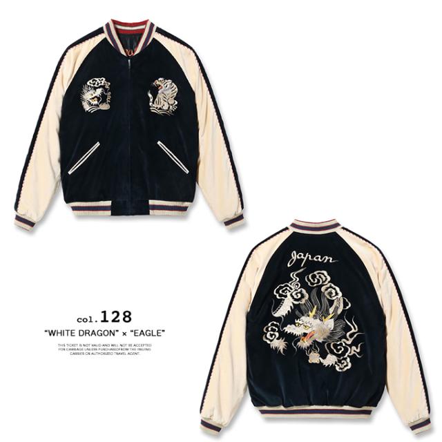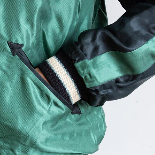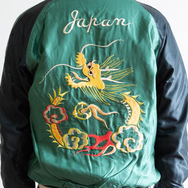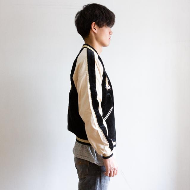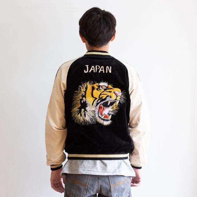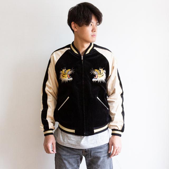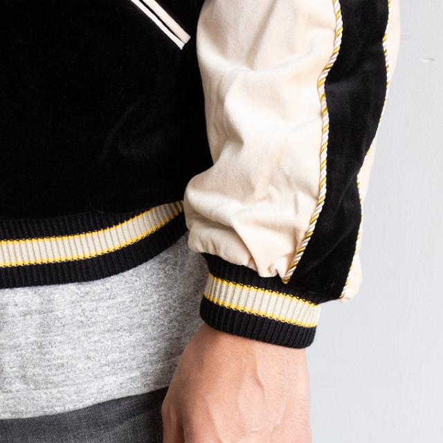 2色の別珍生地を使い、身頃と袖下で2トーンに切り替えたスーベニアジャケット。 “TIGER HEAD” × “GOLD DRAGON” |