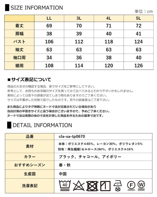 5L:着丈72 肩幅41 バスト124 袖丈63 袖口周40 裾周126