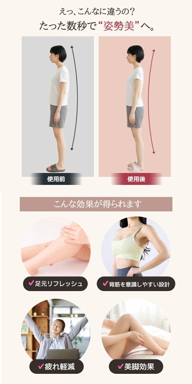 | 【美しさと健康を同時にサポート】 | 履くだけで美脚・姿勢・健康の3方向からアプローチ。通勤や家事、オフィスでも、日常の一歩一歩がセルフケアに変わります。 |