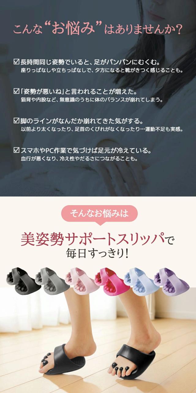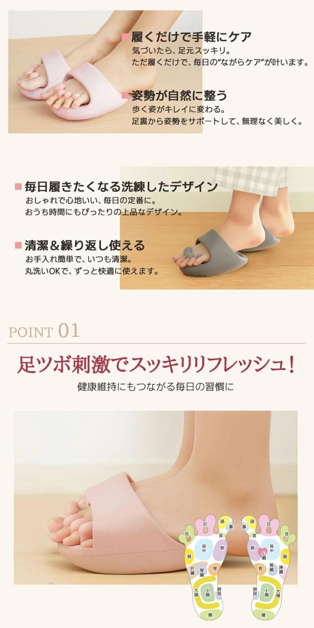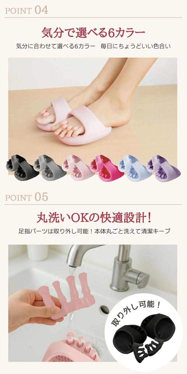 | 【リラックス効果で心も軽やかに】 | 足指ストレッチ×足裏刺激で、履いた瞬間からリフレッシュ。1日の疲れを癒し、心地よいリラックスタイムへ導きます。 |