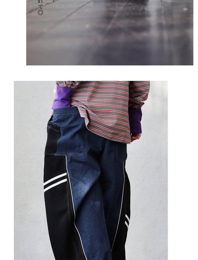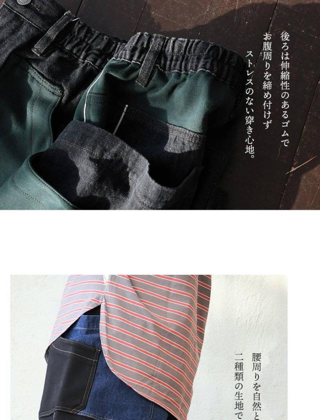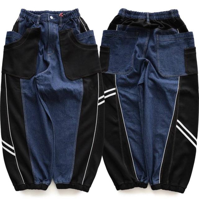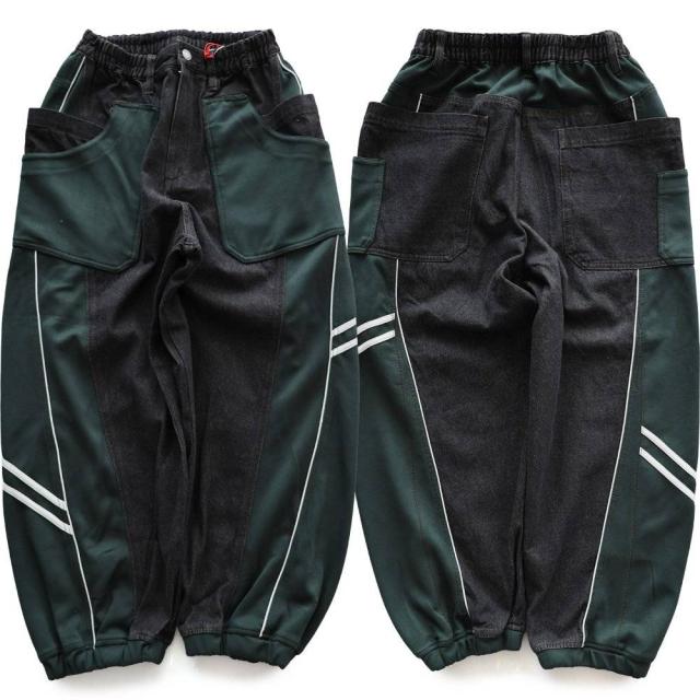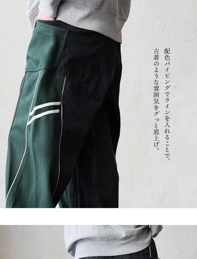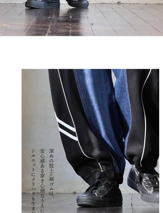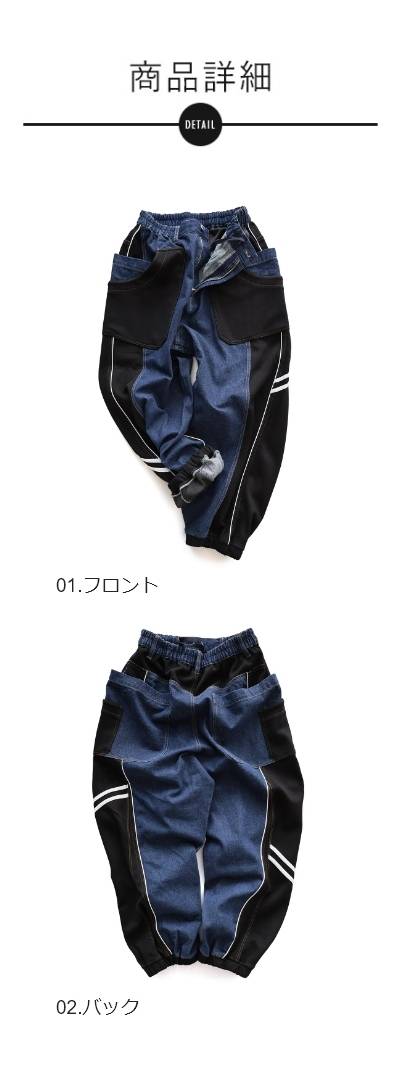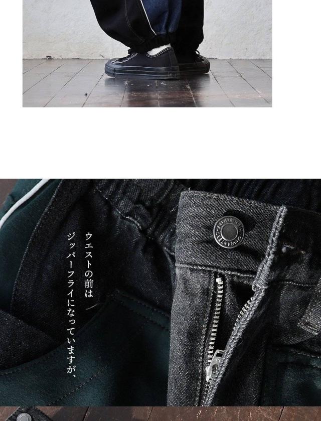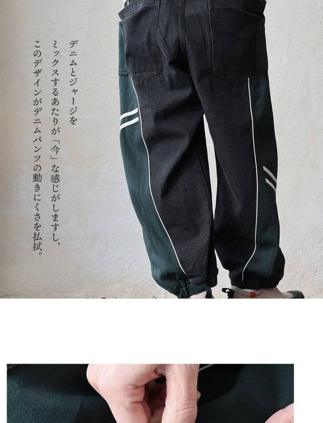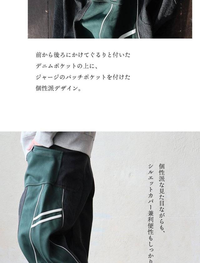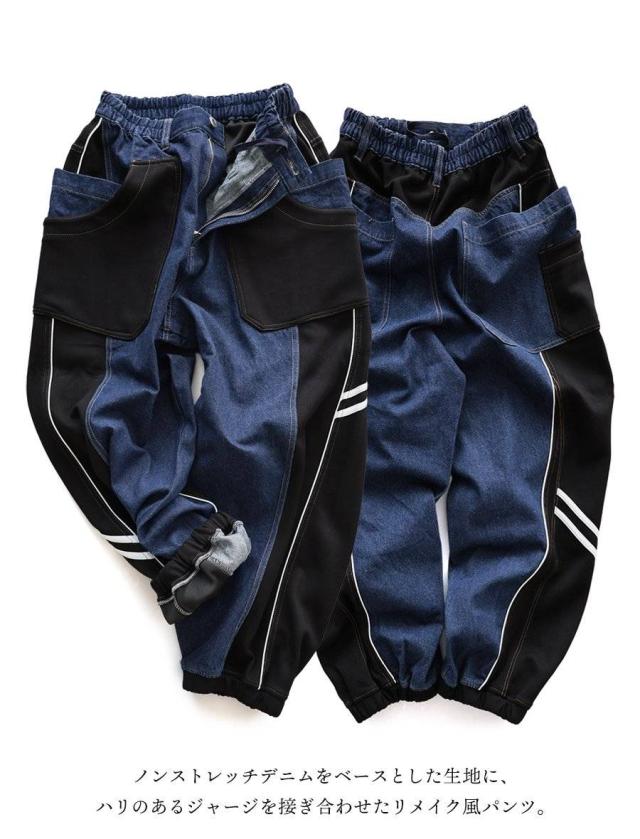 ・ノンストレッチデニムをベースとした生地に、ハリのあるジャージを接ぎ合わせたリメイク風パンツ。