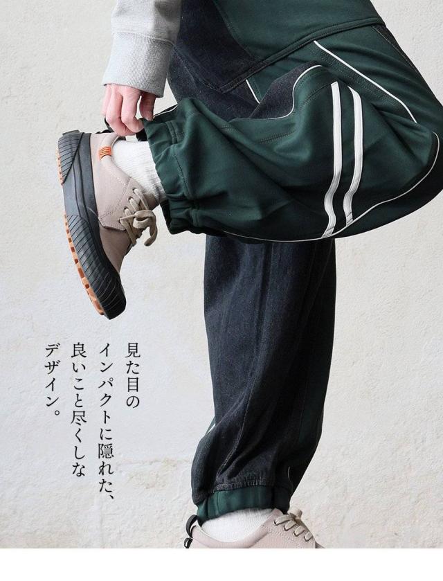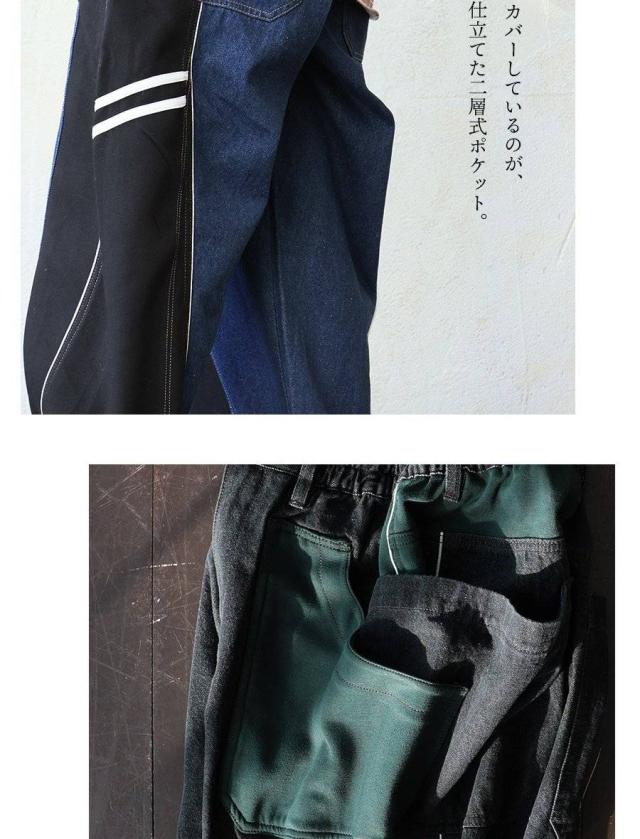 ・デニムパンツを穿いたときの負荷の掛かりやすい部分を、ストレッチ性の高いジャージにすることで突っ張りを軽減。