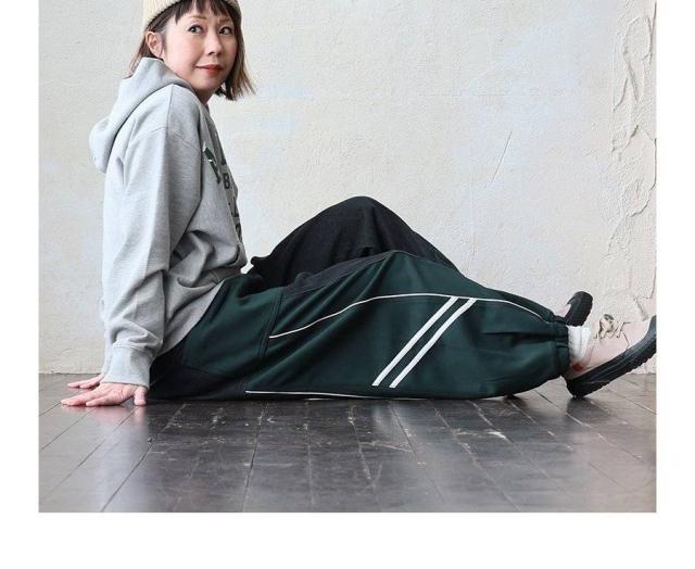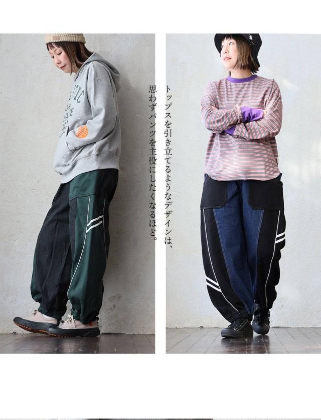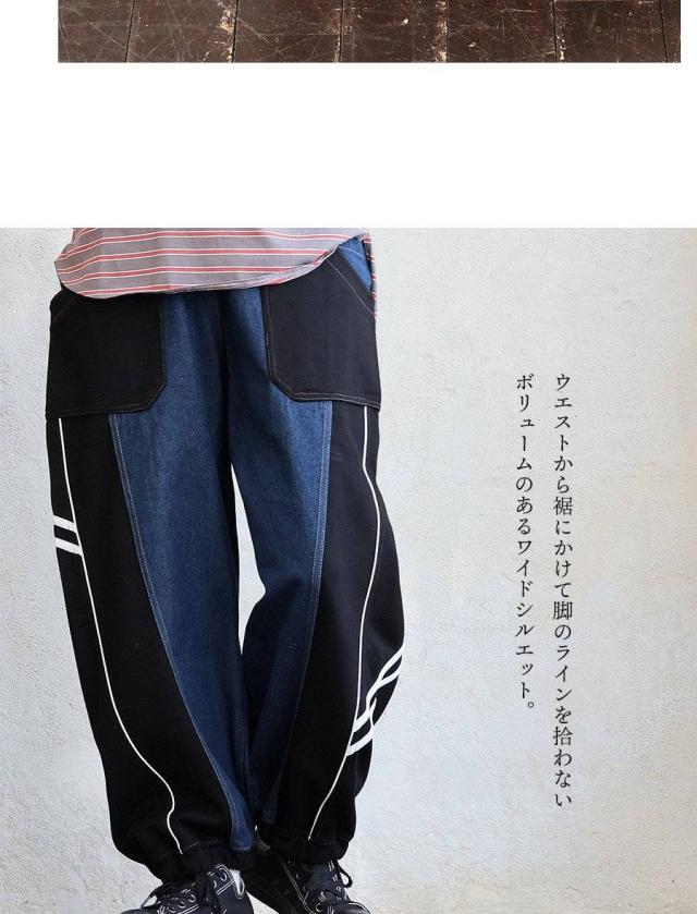 パンツ サルエルパンツ テーパード ワイド レディース デニム ジャージ リメイク風 配色 パイピング 裾ゴム ウエストゴム 楽ちん 大きいサイズ 体型カバー カジュアル パティ