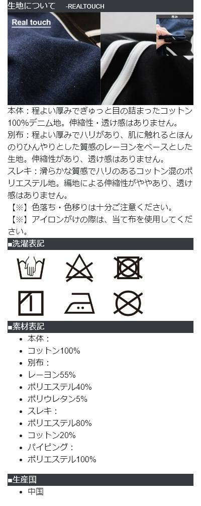 [素材]本体:コットン100% 別布:レーヨン55% ポリエステル40% ポリウレタン5% スレキ:ポリエステル80% コットン20% パイピング:ポリエステル100%