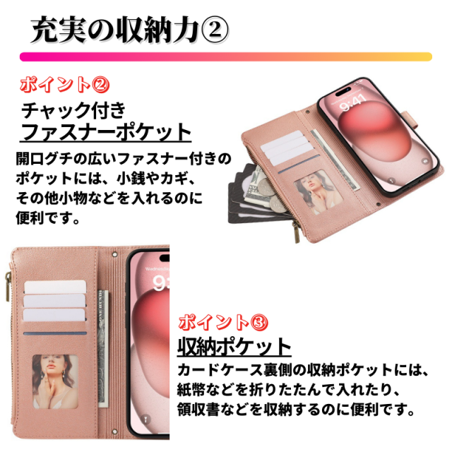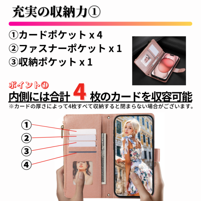 カードポケットx4 収納ポケットx1 ファスナーポケットx1の充実の収納力