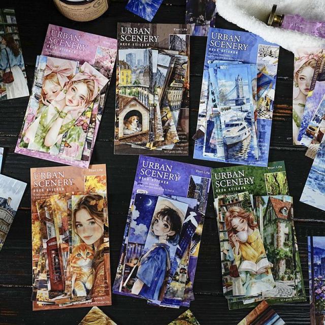 ST802 人物 女性 風景 景色 縦長 細長い 帯状 ネコ イヌ 街並み コラージュ 素材 紙物素材 デザインペーパー 背景紙 紙もの 手帳 日記 海外 紙モノ 紙物