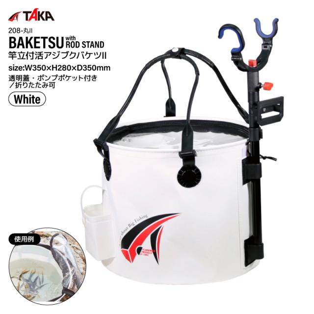 釣り バケツ アジ活かしバケツ ホワイト 35cm 竿立て付き 折りたたみ 透明蓋 ポンプ対応 生き餌 活アジ 鮮度保持 泳がせ釣り ヤエン釣り 活魚 水汲み エサ用 堤防 磯釣り 竿受け 角度調整 高さ調整 208-丸2 タカ産業