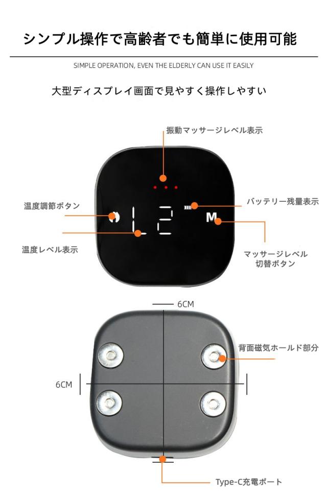 大型ディスプレイで温度、マッサージモード、バッテリー残量が一目瞭然。直感的なボタン操作で簡単に設定可能。