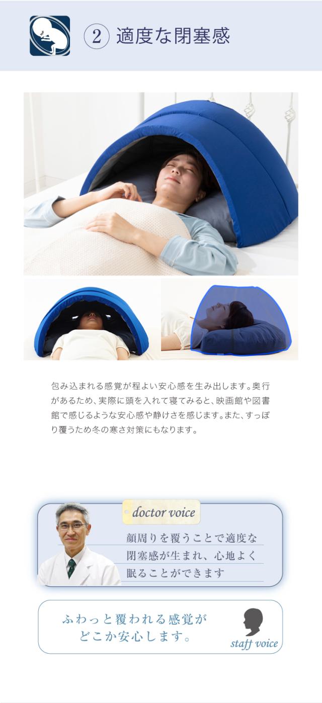 顔周りを覆うことで適度な閉塞感が生まれ、安心感に包まれながら眠れるのもポイント。