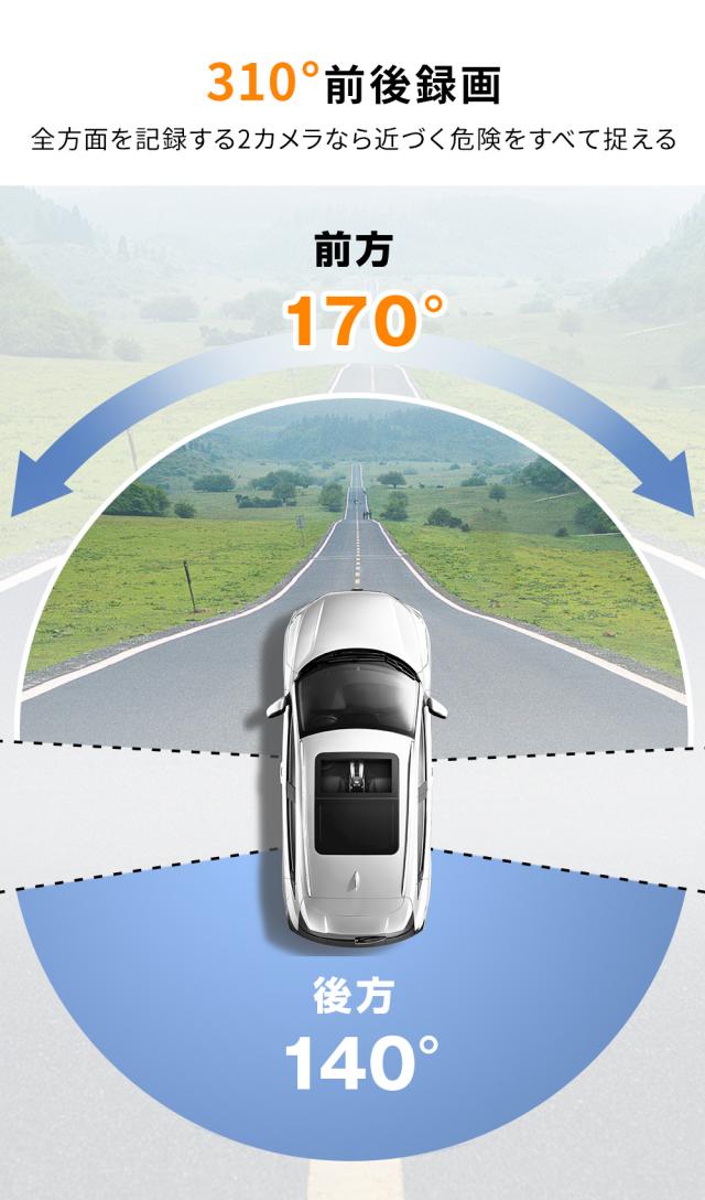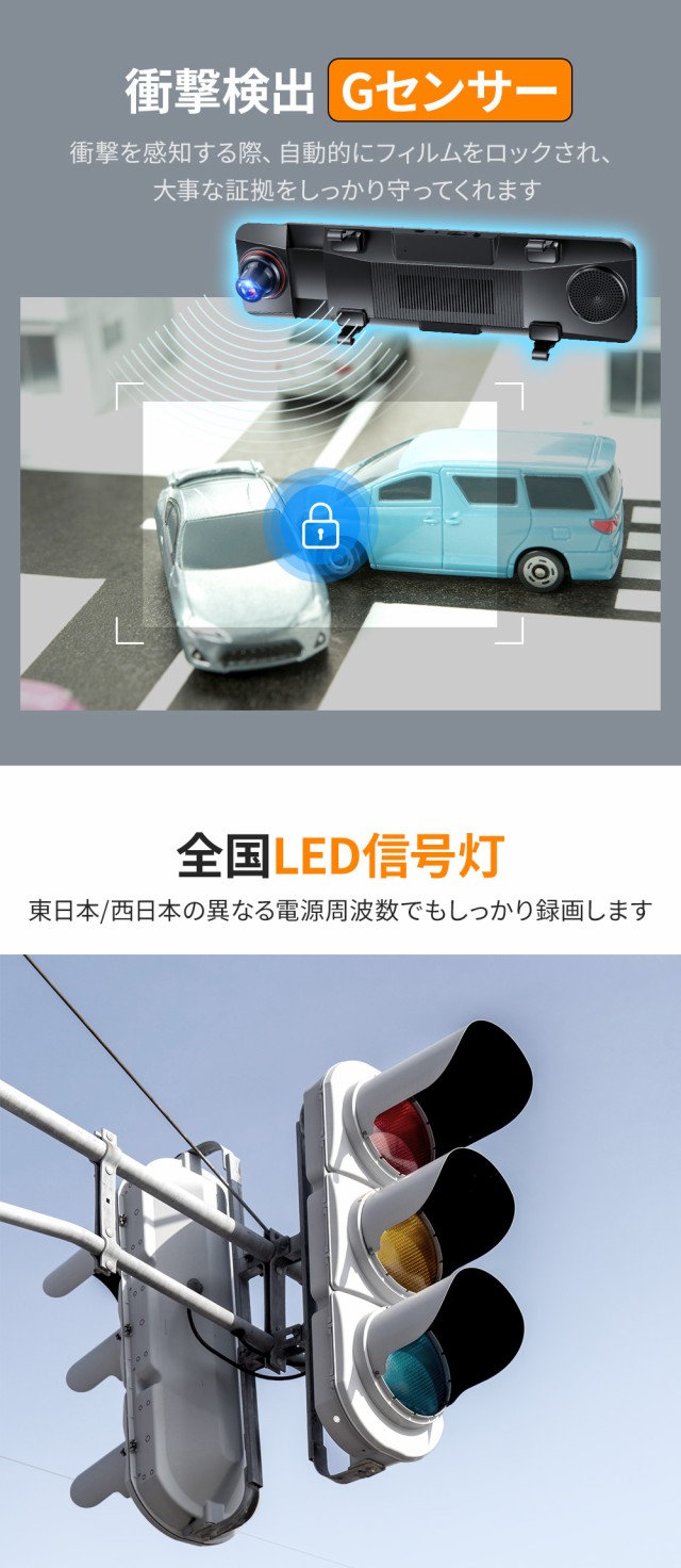ドライブレコーダー業界先端のSonyIMX589センサーを採用し、2カメラ同時高画質録画可能フロントカメラフルHD4K+リアカメラフルHD1080Pを実現しました。万が一の時に、状況証拠を残すためには前方だけではなく、後方の記録することは重要です。そこて弊社は、フロントカメラとリアカメラをセットにして、前後同時録画可能、死角が少ないため、「あおり運転」や「後方からの追突」等からあなたをいつも見守って、安心ドライブをサポートします。