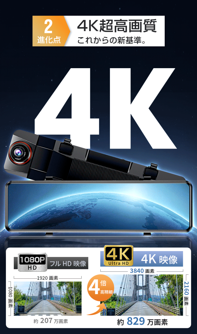 話題の4K超高画質デジタルルームミラータイプ、前後2カメラ対応のドライブレコーダーがいいよいよ登場!本製品のフロンカメラはフルハイビジョン(1920×1080px)の4倍にあたる解像度4K(3840×2160px)で映像を記録でき、万が一の時に重要な前方車両のナンバーをはじめ、道路標識や信号機など、記録の細部までに確かな視認性を誇ります。