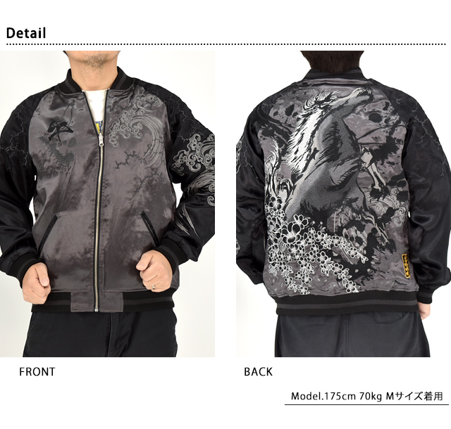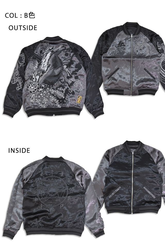 絡繰魂さんから「粋 2026午年限定リバーシブルスカジャン(261036)」のご紹介です。 重みを感じる程の刺繍量が魅力的な粋シリーズから、最新作のスカジャンが登場しました。 今回は2026年新春記念スカジャンということで、干支の「午」をモチーフの主役に採用しました。 背中には墨で描かれたような躍動感溢れる馬をダイナミックに刺繍しました。 絵柄は身頃から袖へと続いているため、実際に着用した際にはより立体感をお楽しみいただけます。 馬柄のスカジャンは非常に珍しく、他ではなかなかお目にかかれない逸品であること間違いなしです。 表面はしっかり柄の入ったスカジャンですが、対象的に裏面はシンプルに仕上げ、メリハリを付けました。 ボディーにはレーヨンサテンを使用し、ドレープや陰影がくっきりと現れています。 | ||||||||||||||||||||