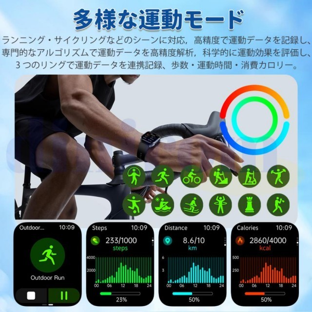走行距離など日々の様々な活動量の計測が可能 Smart Watch です。アプリでライニング時間を設定でき、働作を記録し、運動軌跡などが一目瞭然です。このスマートウォッチはランニング、ウオーキング、サイクリングなどのスポーツモードが搭載され、アプリと接続すれば、運動距離、時間などデータを記録できます。沢山のスポーツモードを選択することができ、体の状況により運動目標を設定してしっかり管理を実現できます。このスポーツウォッチは屋外屋内のランニング、バスケットボール、自転車、テニス、バレーボール、サッカーなどの種類運動モードが付いて、合理的に運動量、運動時間を管理することができます。スマートウォッチの言語に日本語/英語/中国語など多国の言語を自由に設定できます。また、腕時計側でスマホの音楽を前の曲/次の曲/一時停止/再生をコントロールできます。