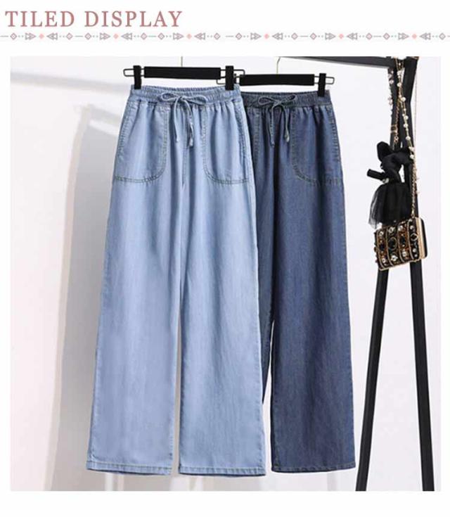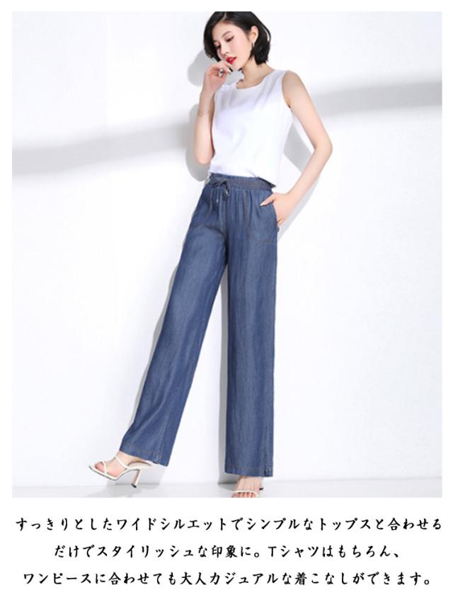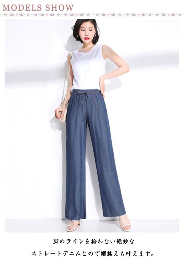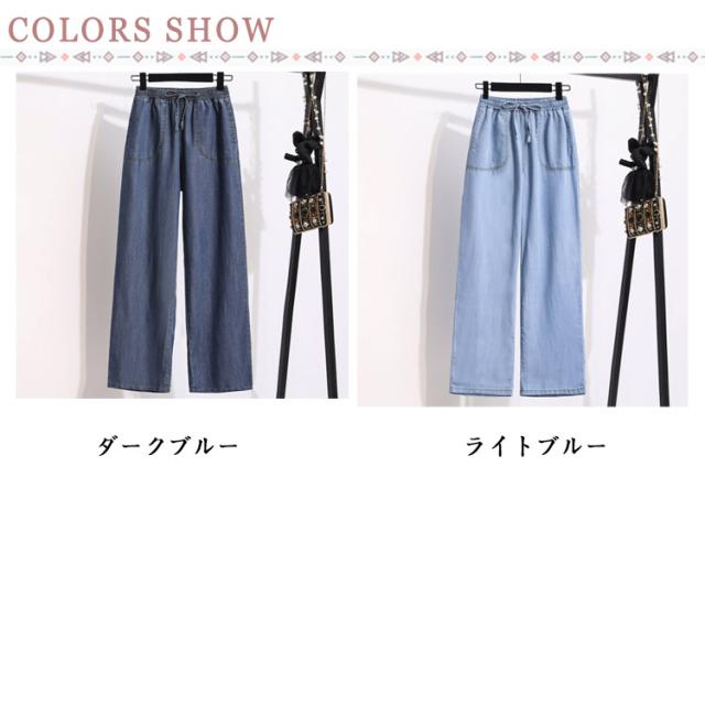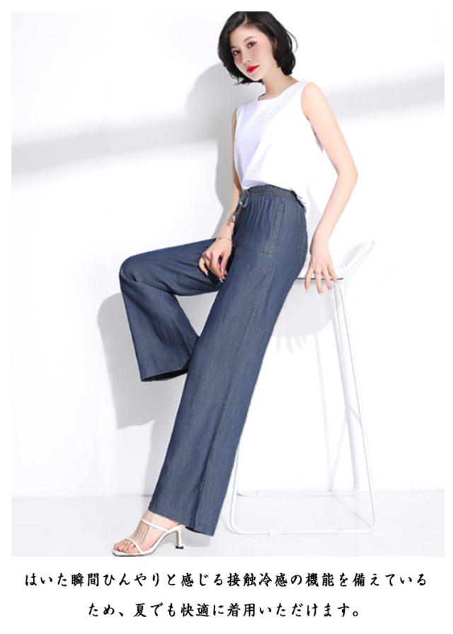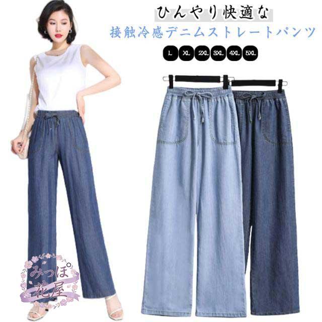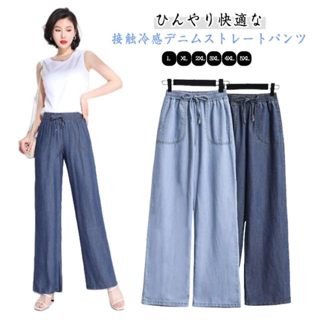 イージーパンツ デニムパンツ ジーパン 接触冷感 大きいサイズ アイスシルクパンツ アイスシルクパンツ ウェストゴム ポケットあり ひんやり 薄手 ロングパンツ レディース ジーンズ デニムワイドパンツ UVカット ストレートパンツ ウエストゴム ゆったり 体型カバー 春 夏
