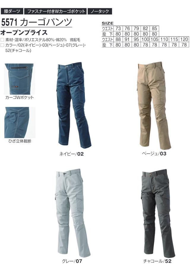 5571 カーゴパンツ(膝ダーツ・ファスナー付きWカーゴポケット・ノータック)